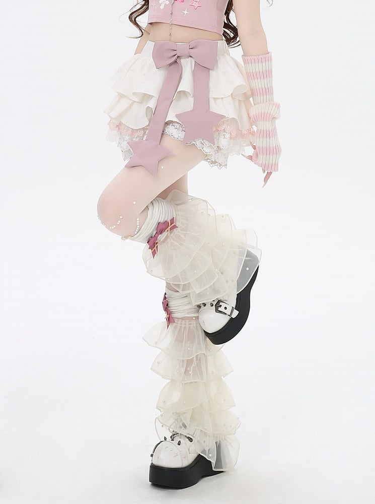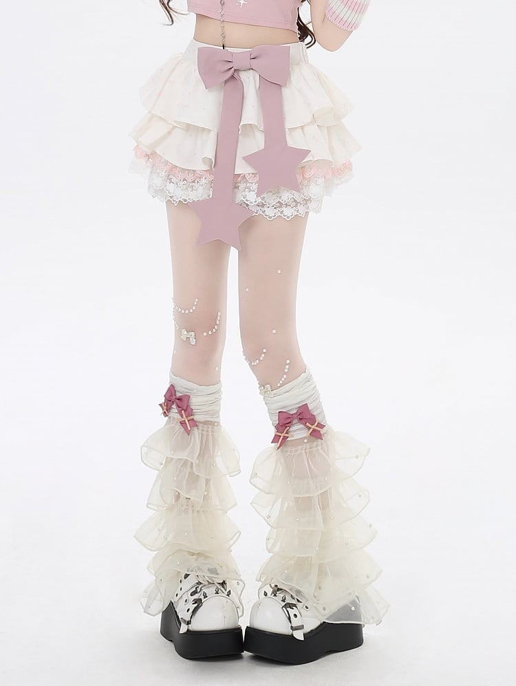 ピンクの大きなリボン、アプリコットの全体にリボンプリント、レーストリム、裏地付きティアードスカート