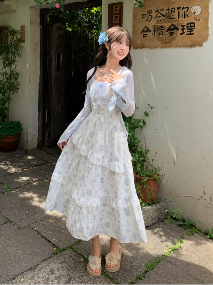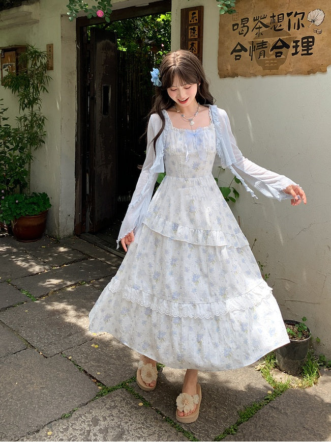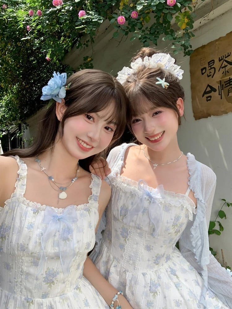 青と白のオールドスクールロリータファッションドレス 蝶結びディテール JSK セット