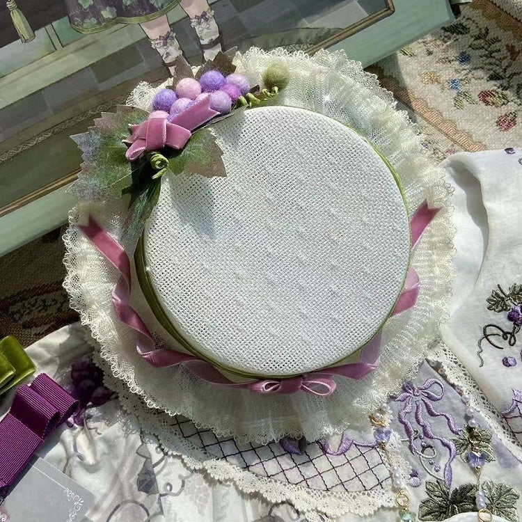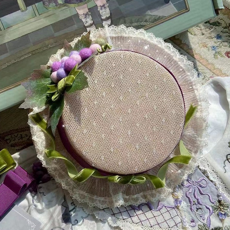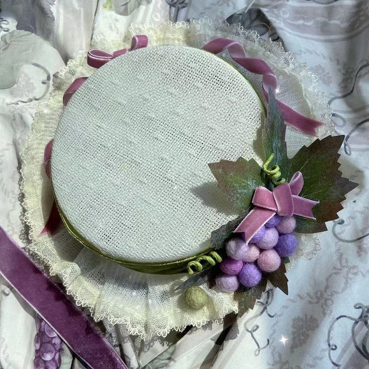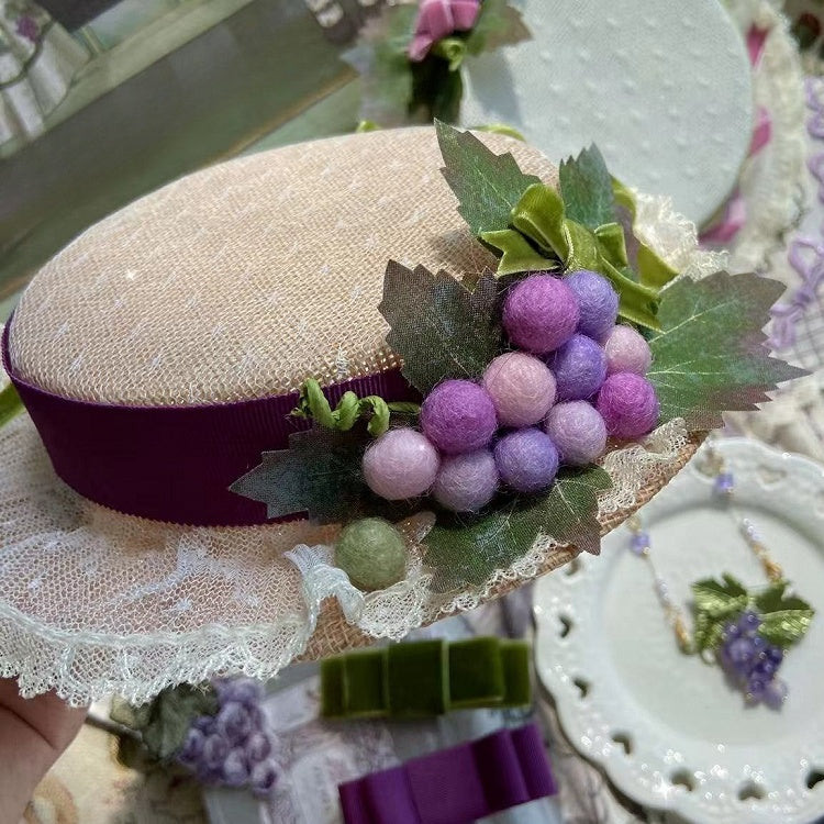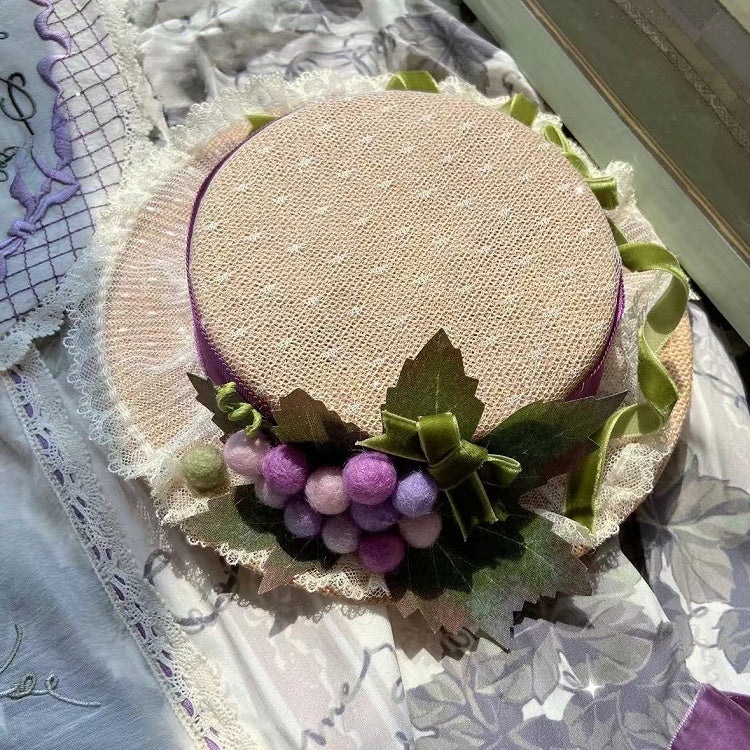 ブラウン/ホワイトのブドウ柄で飾られた蝶結びのディテールとレーストリムのミニハット