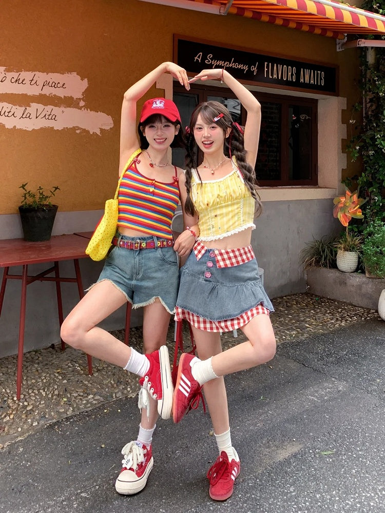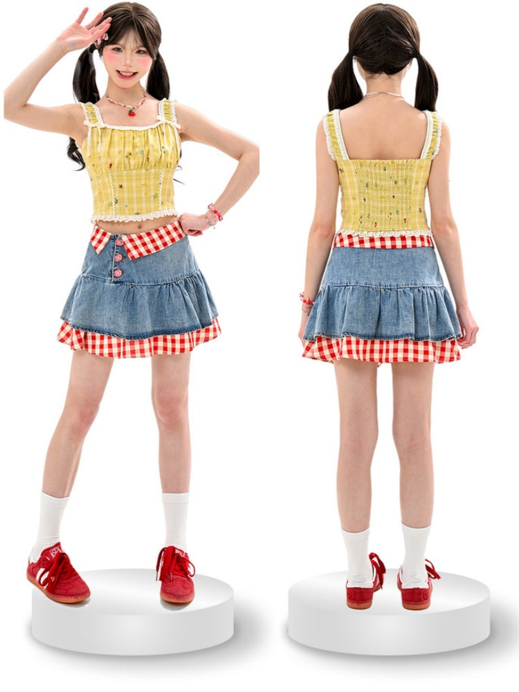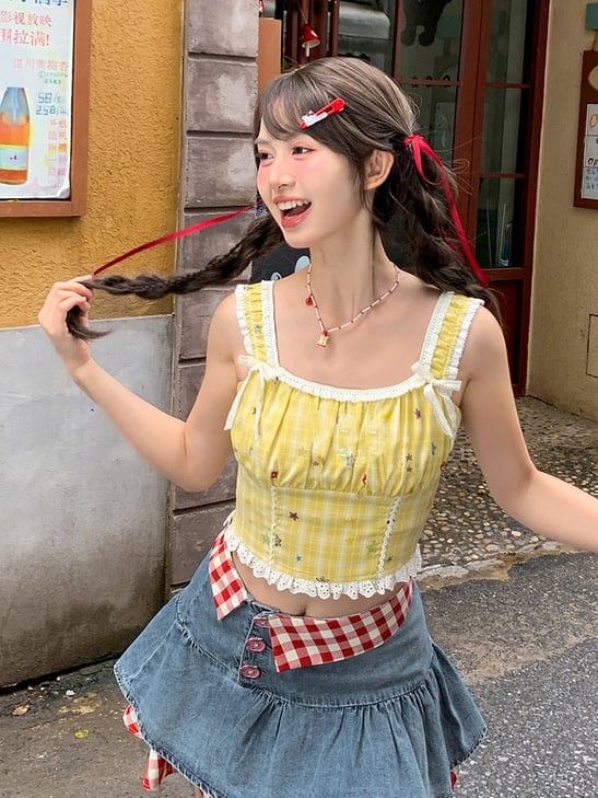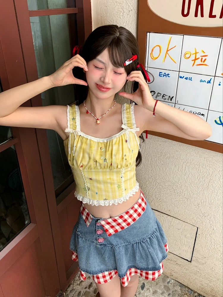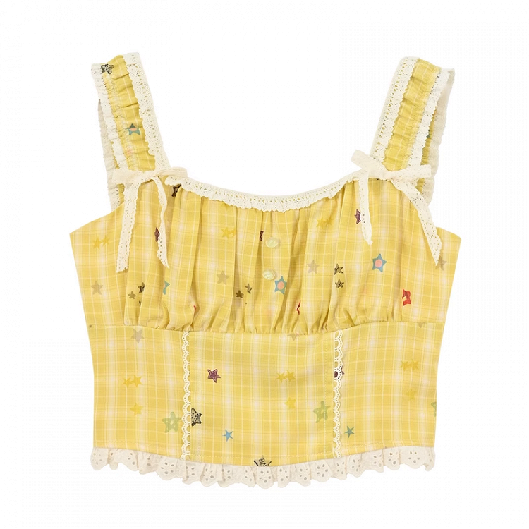 トリムレーススタープリントトップ イエローチェック柄 クロップド丈 ノースリーブ
