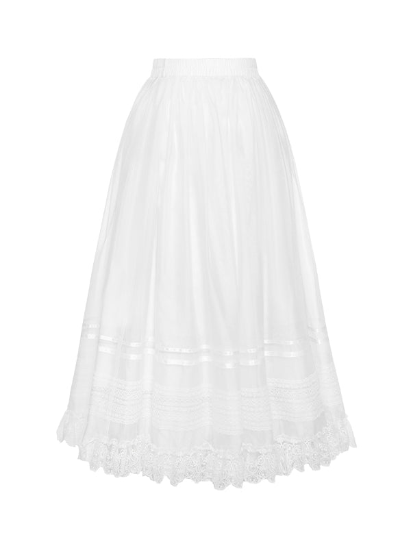 ウエスト下のトリミング、白いスカート、伸縮性のあるレースの裾