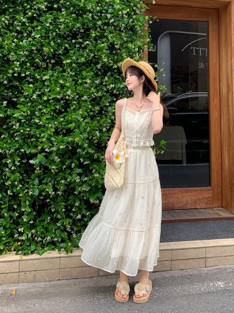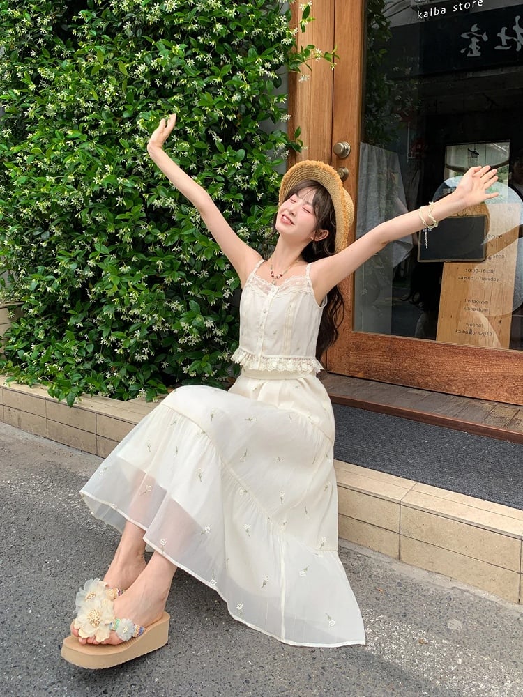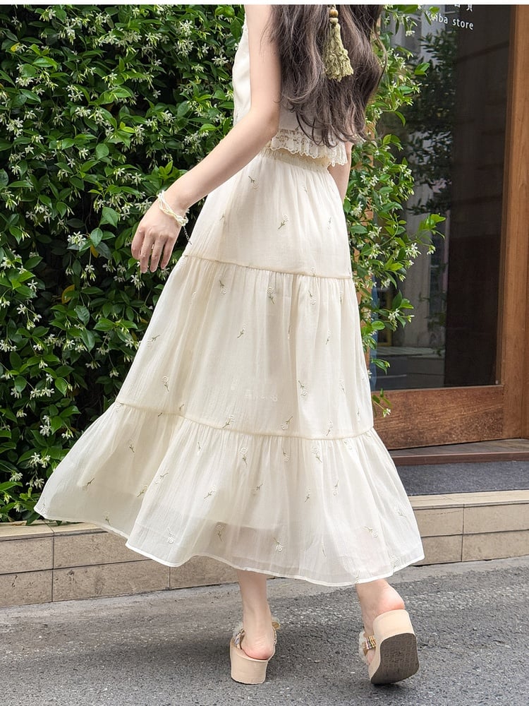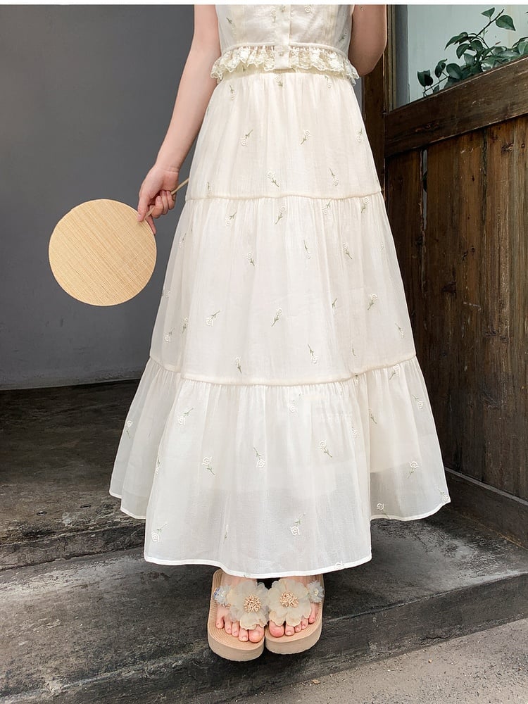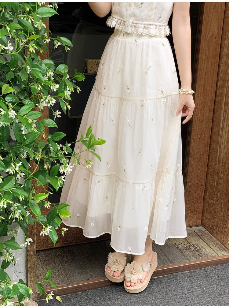 チュールスカート ケイ ベージュ ウエストゴム 花柄刺繍 森
