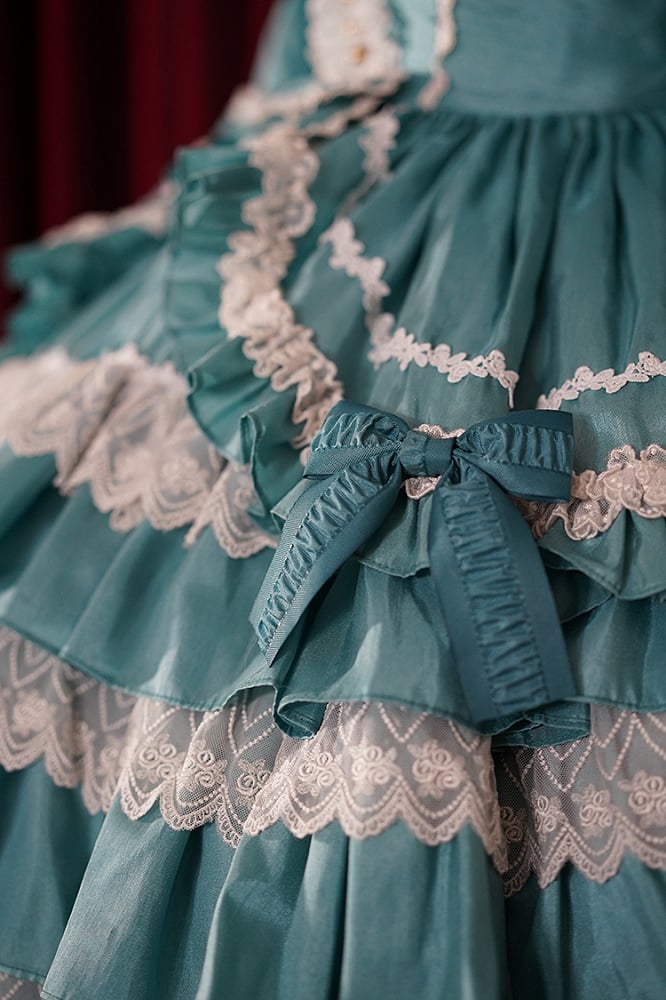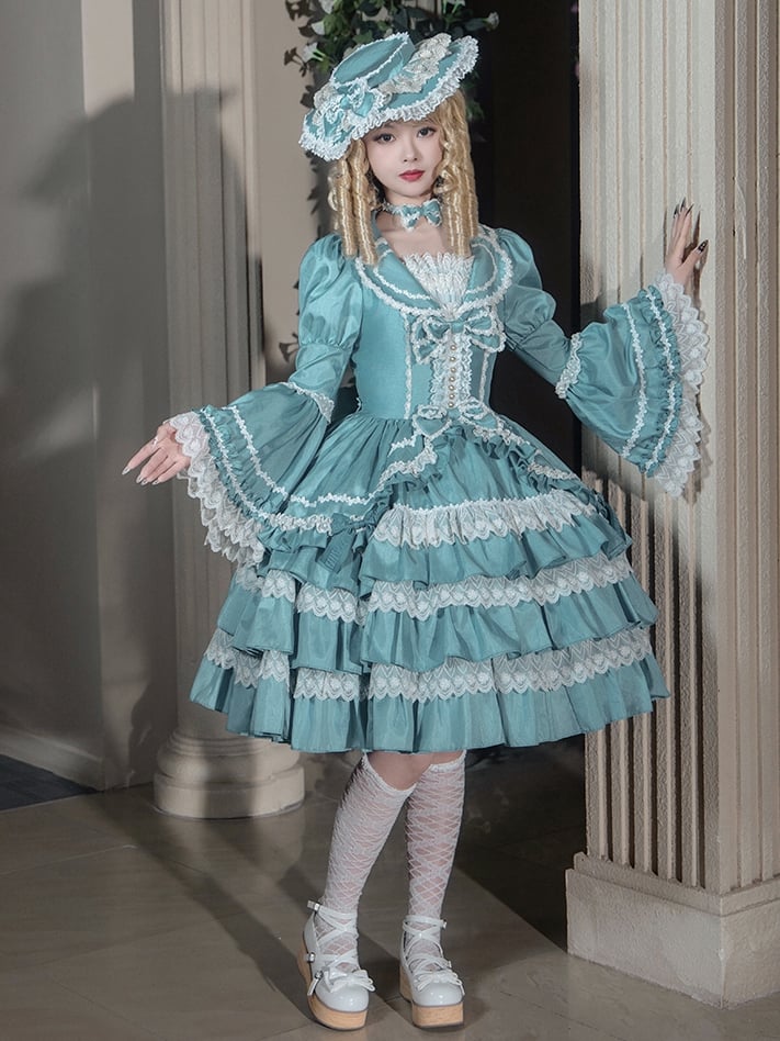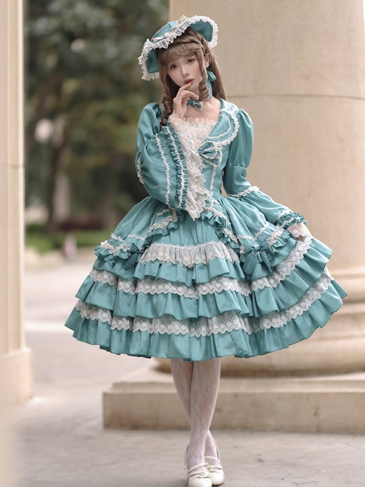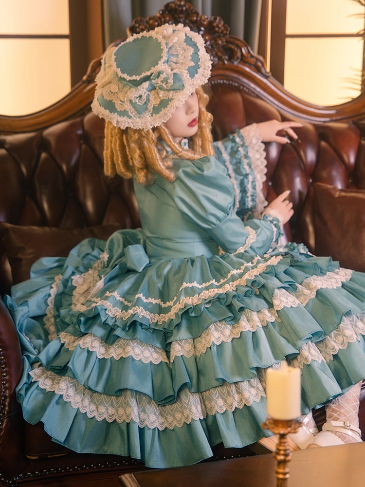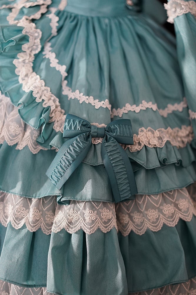 ターコイズグリーンのティアードフリルスカート、長袖ロリータドレス