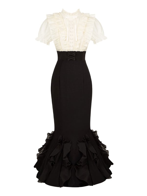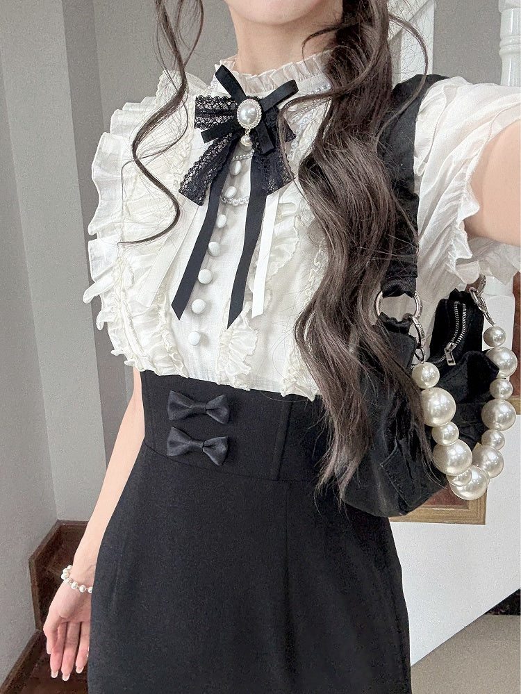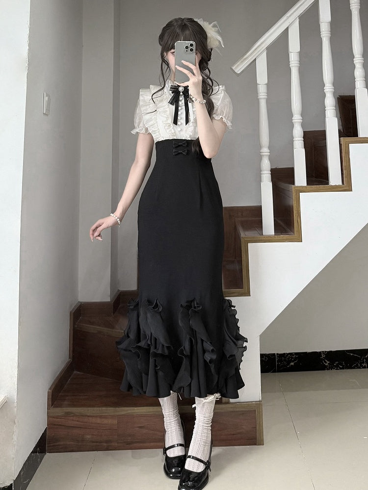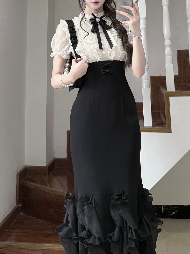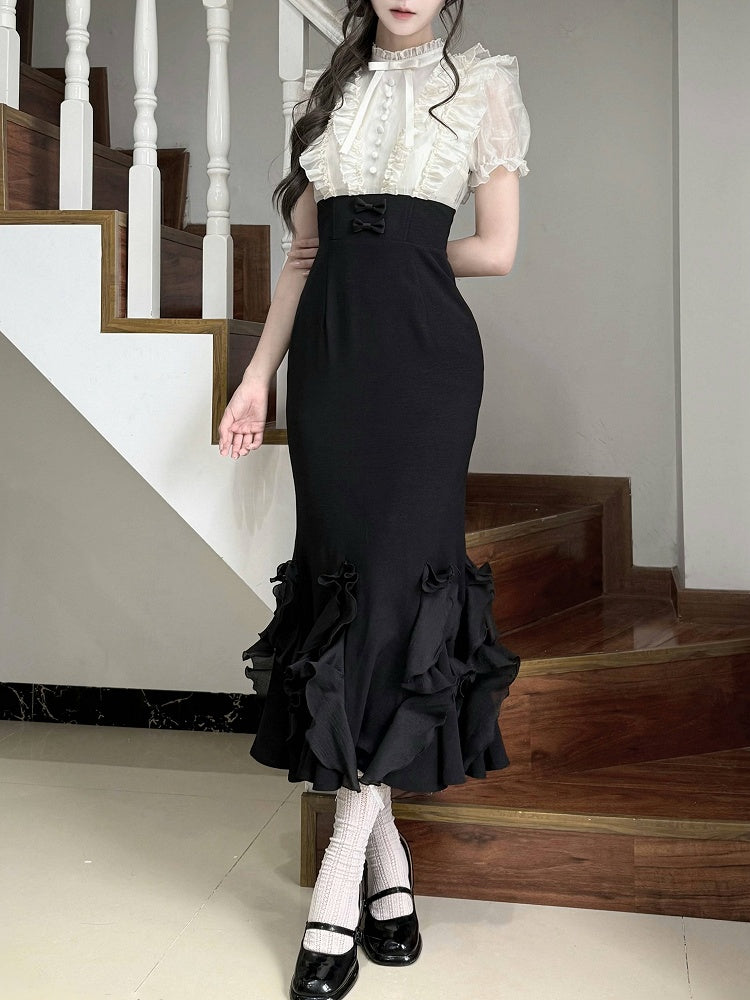 フェイクツーピースデザインベージュブラウスとブラックマーメイドスカート、ボーンウエストのエレガントなロリータドレス