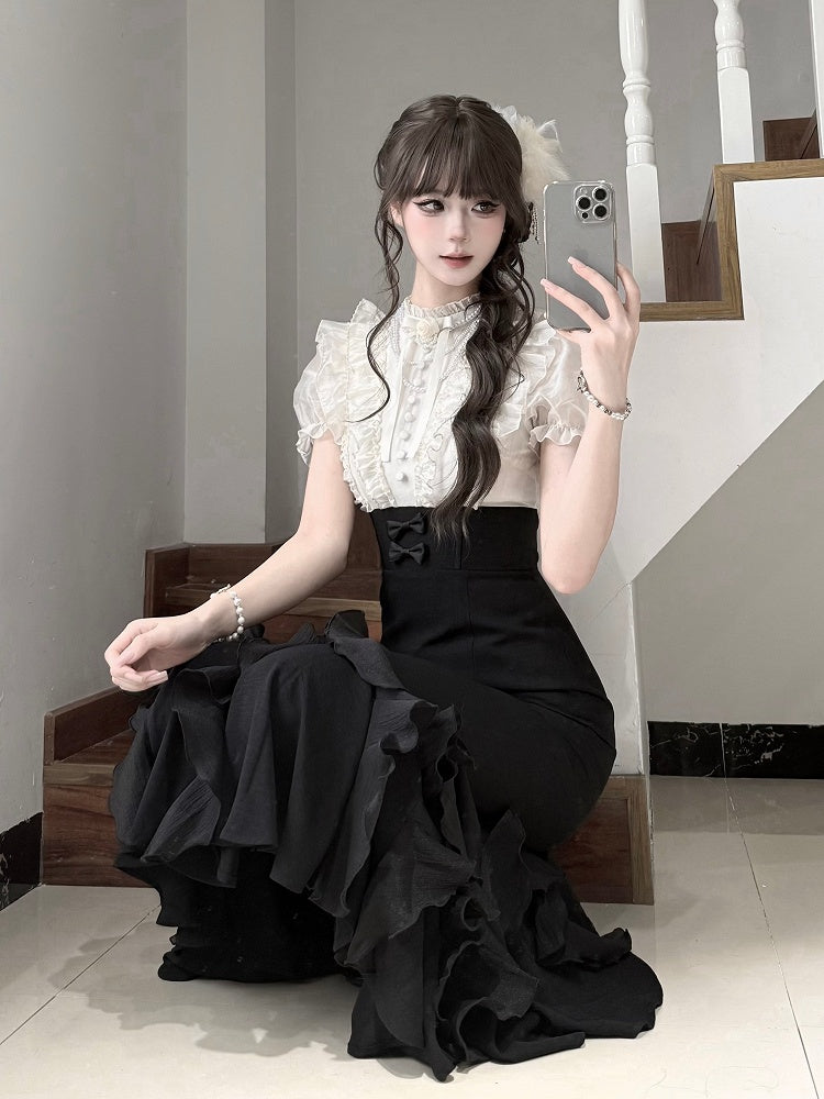 2つのフェイクドレススカートデザインウエストピースマーメイドボーンとブラックロリータブラウスベージュエレガント