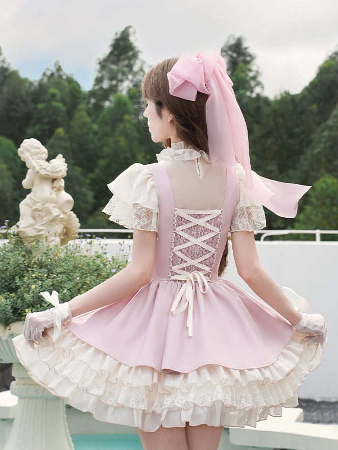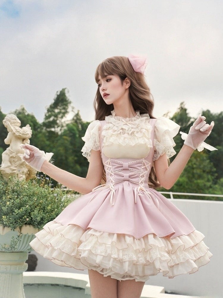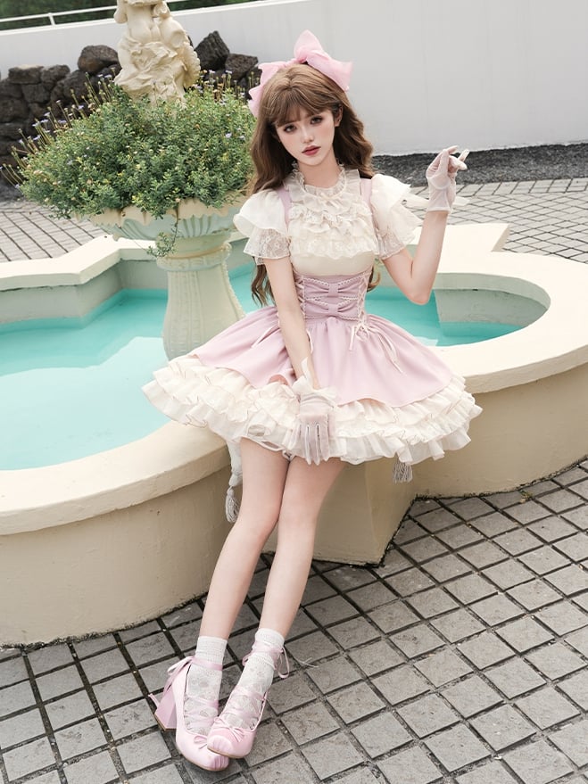 ピンクのレースアップディテール、アンダーバストロリータJSK + ベージュブラウス + キャミトップ