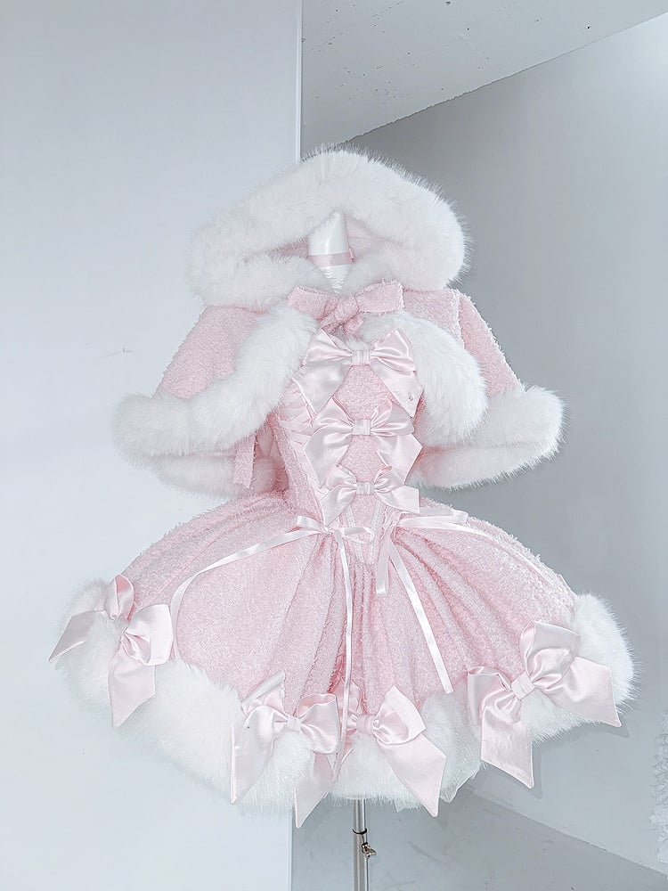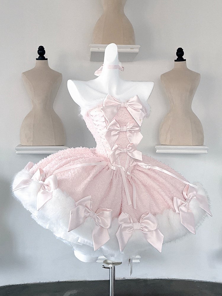 ピンクと白のオールドスクールロリータファッションドレス、蝶結びディテール、ロリータJSKセット