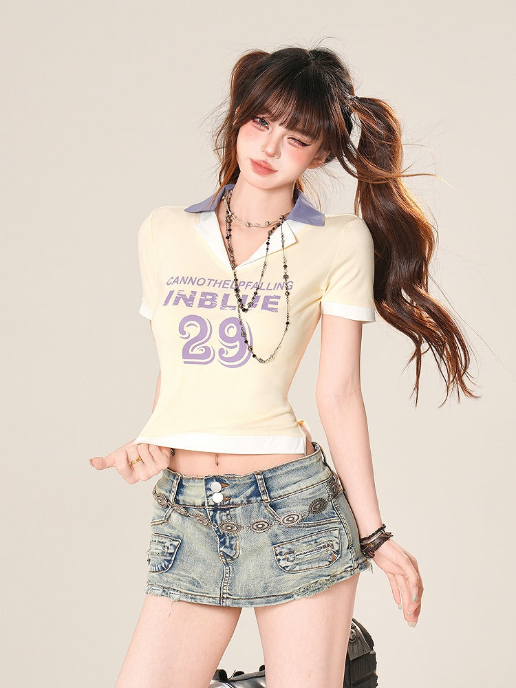 Vネック ピンク/イエロー/ブルーと数字プリントTシャツ レター