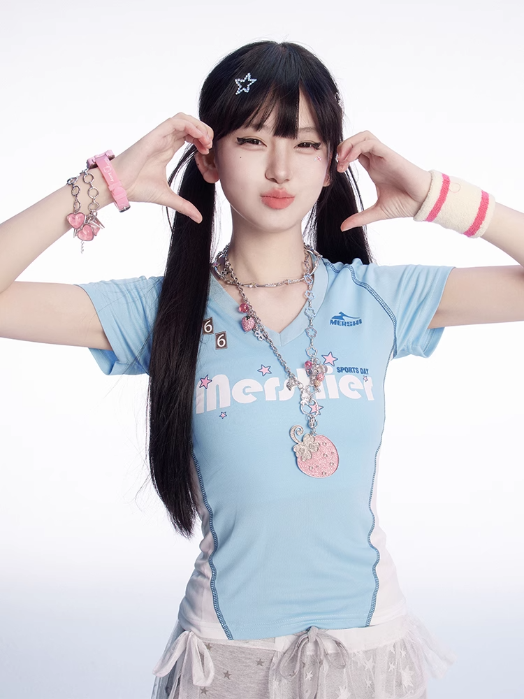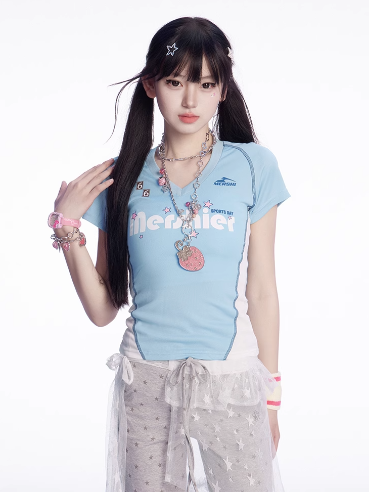 Vネック スリムフィットTシャツ ブルー&ホワイト カラーブロックデザイン