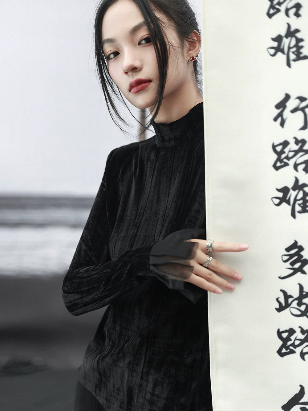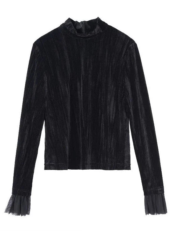 ベルベットダークタートルネックスプライシングシャツメッシュレトロ