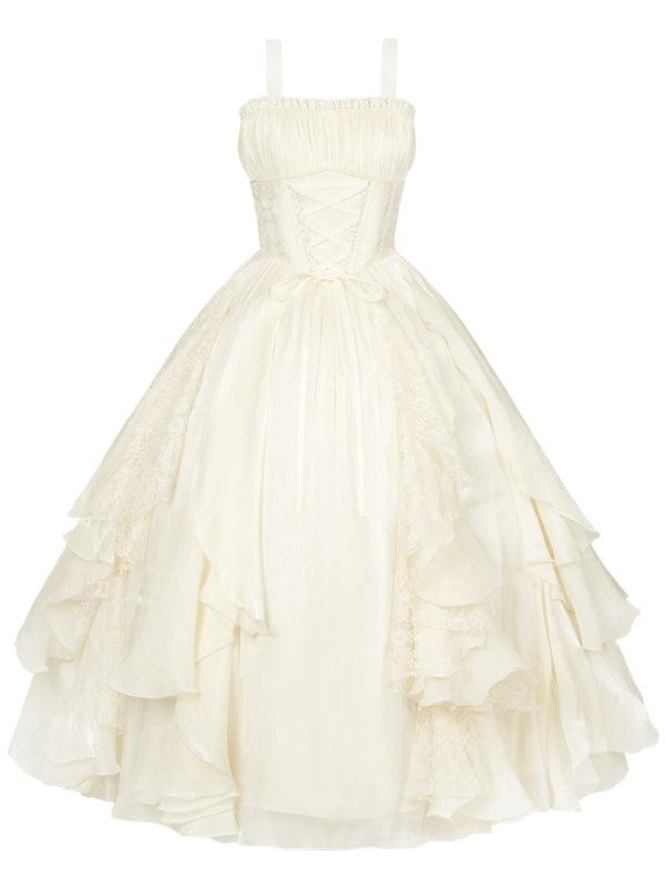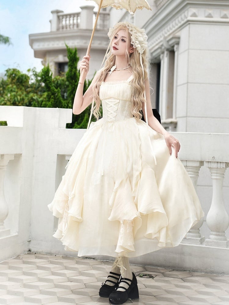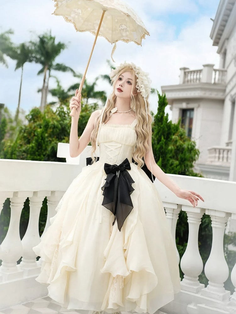 ベージュのボーン入りバスクウエストカスケーディングフリルスカートロリータドレスロングバージョン