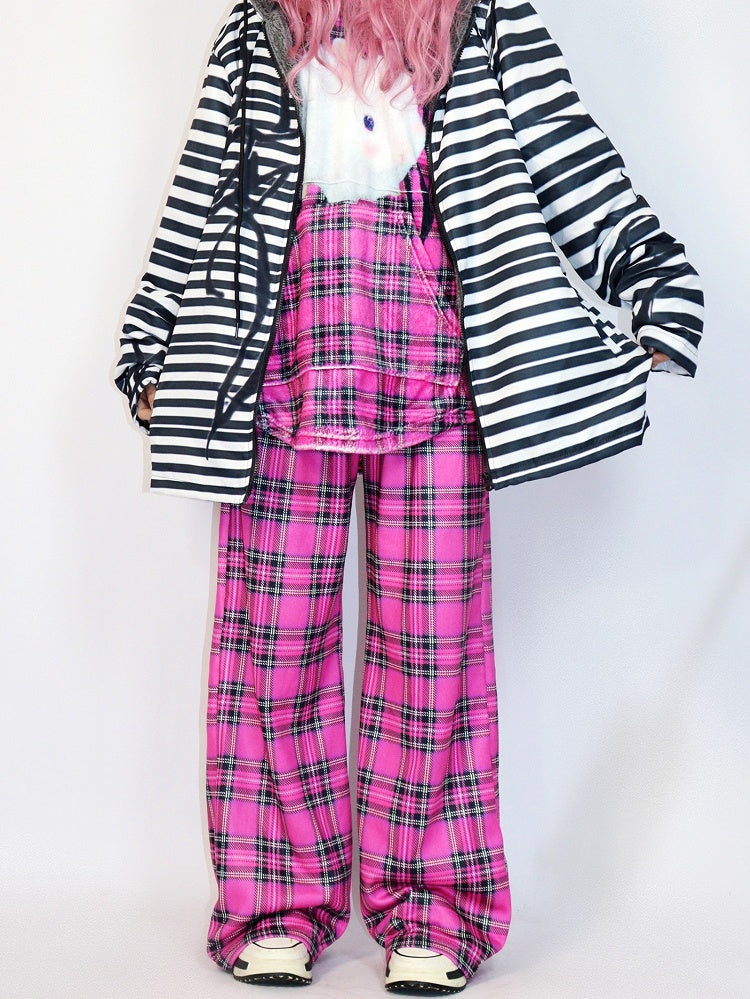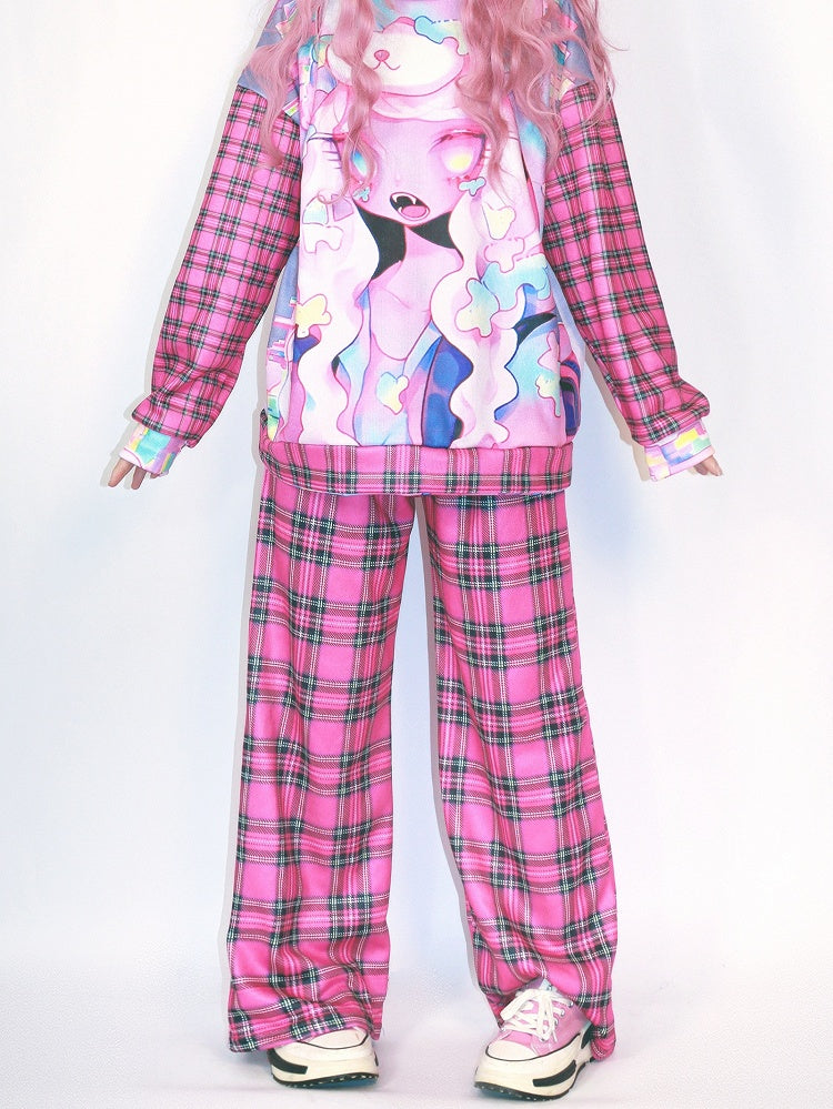バージョンパターンローズチェック柄ワイドレッグパンツギャルレッドファッション厚手カット