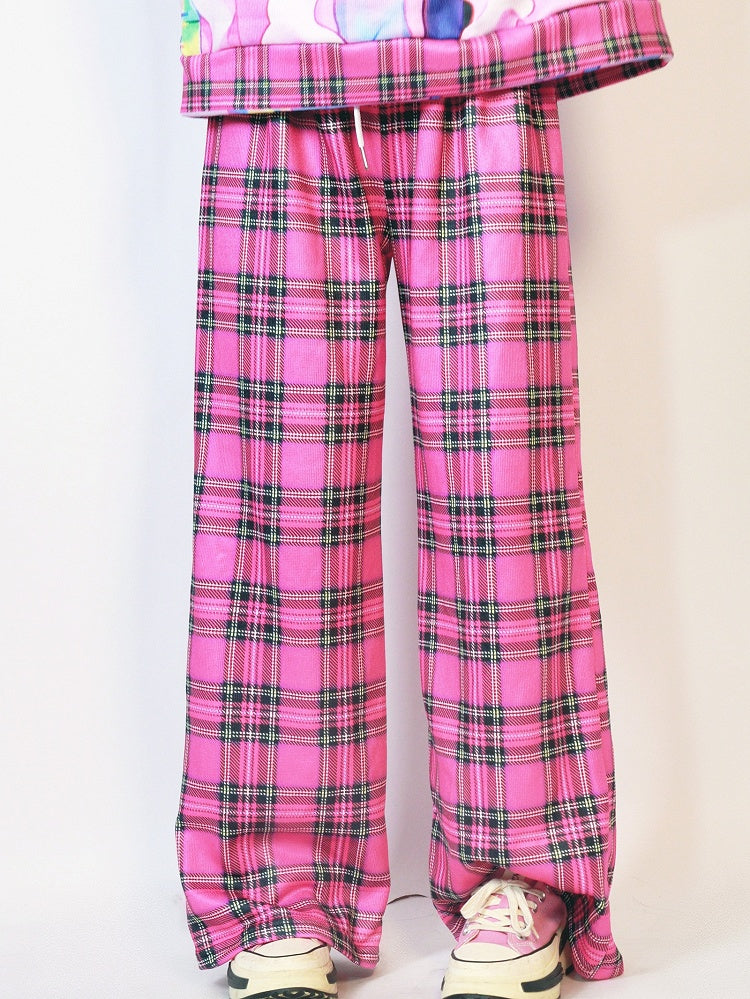 ローズレッドギャルファッションチェック柄ワイドレッグカットパンツ厚手バージョン