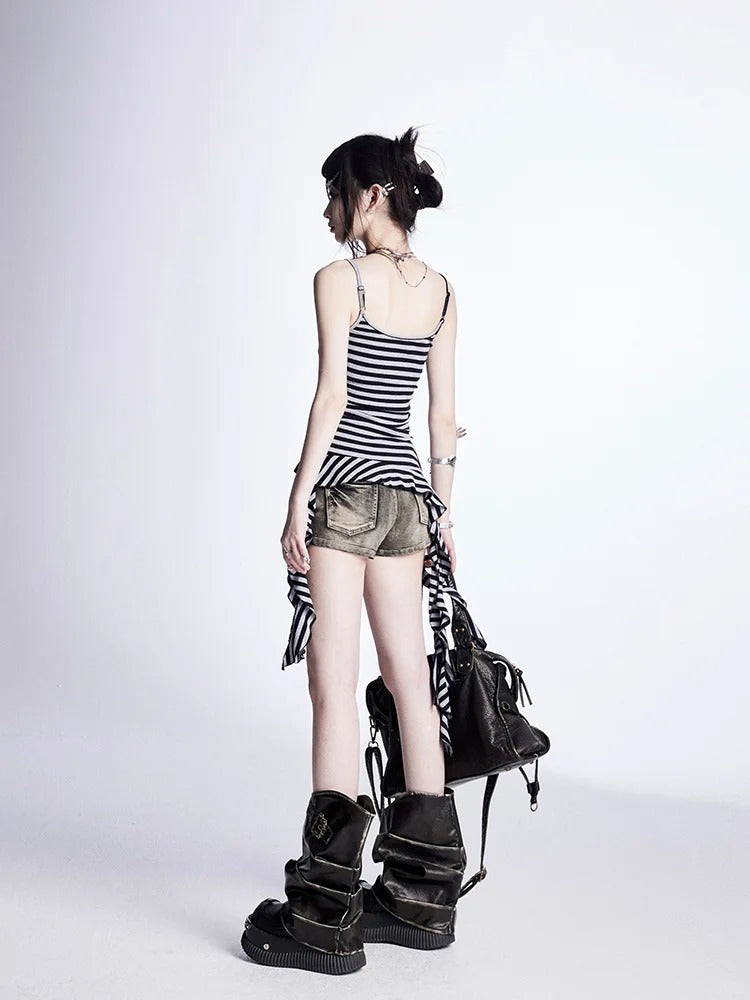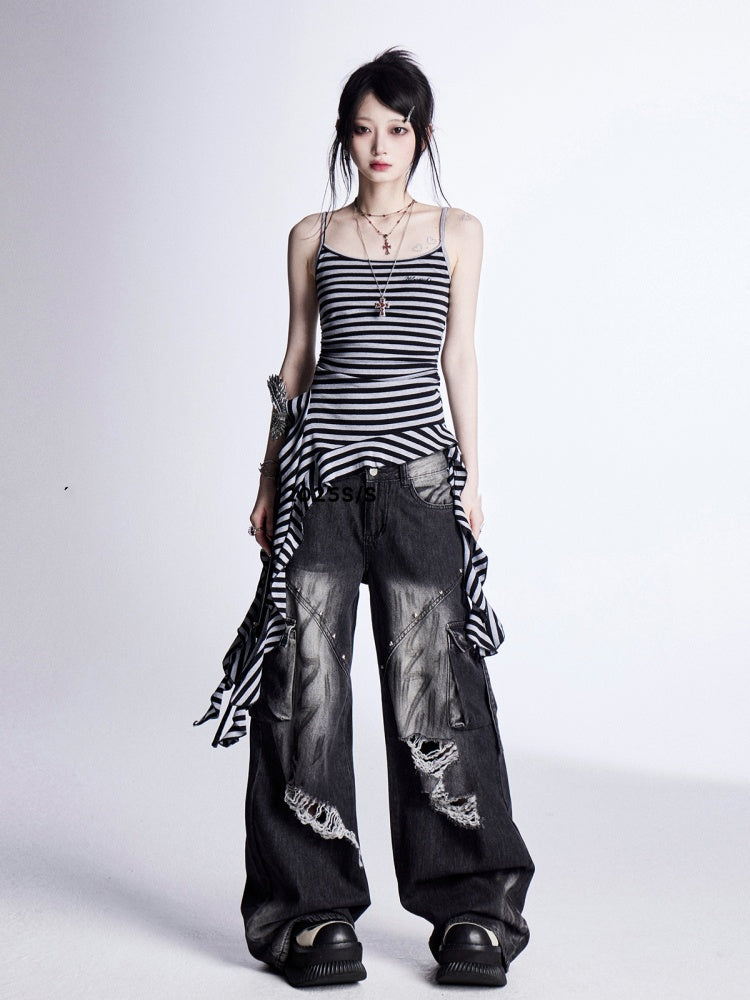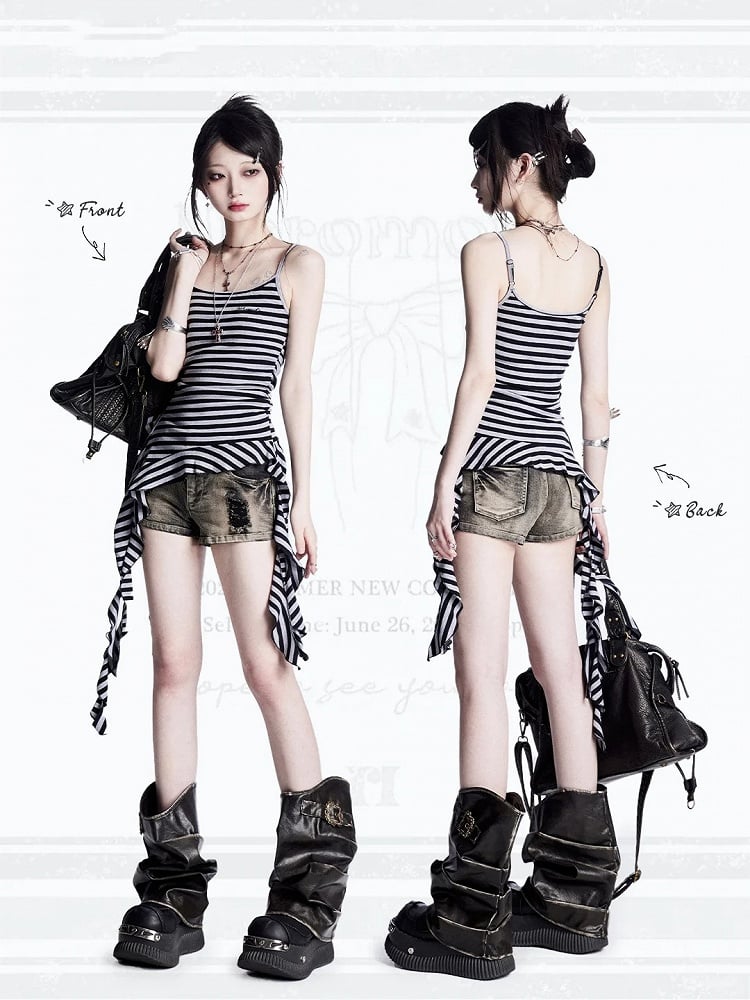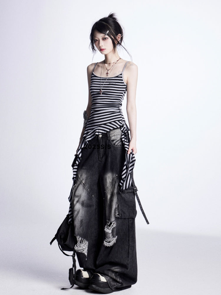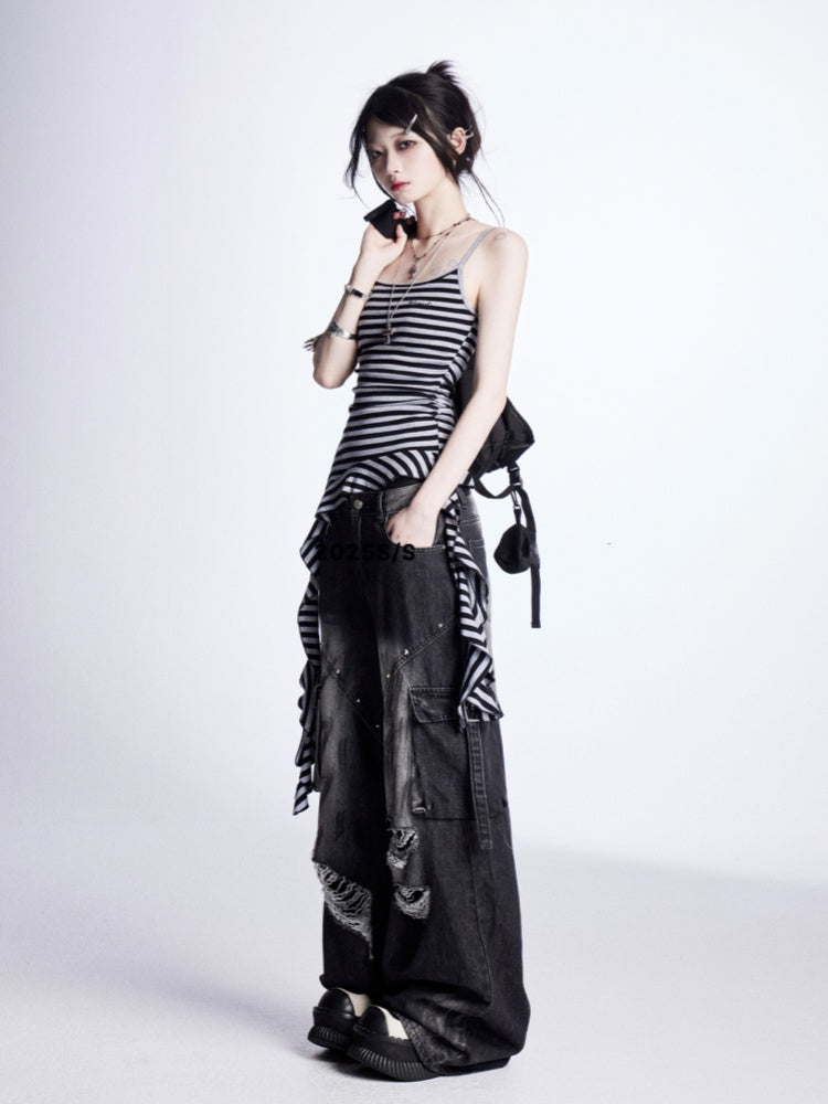 ブラック&グレーのストライプ、カスケーディングフリルのアクセントがヴィンテージなキャミソールトップ