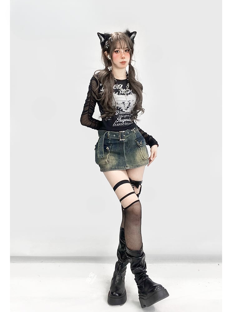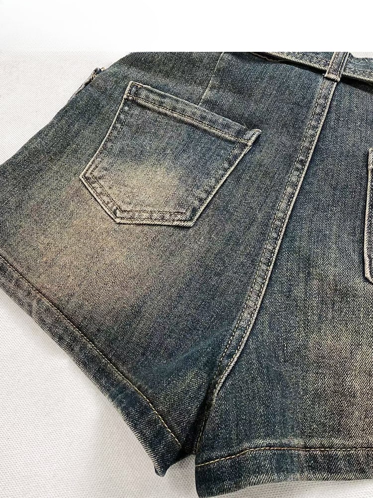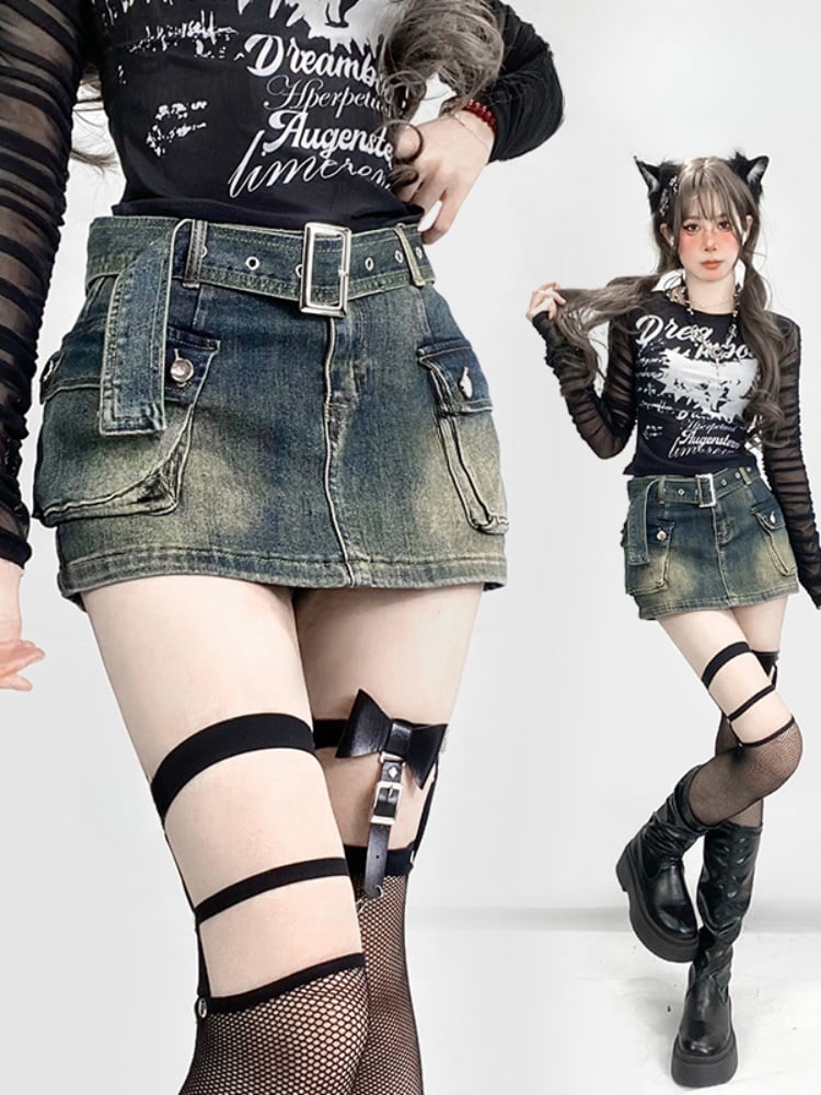 ヴィンテージのダークブルーにダメージ加工を施したデニム素材のグラマラススカート。カーゴポケットがスタイリッシュさと利便性をプラス。チャーミングなデザインは、どんなカジュアルなお出かけにもぴったり。このキュートなスカートで、周りの注目を集めましょう。