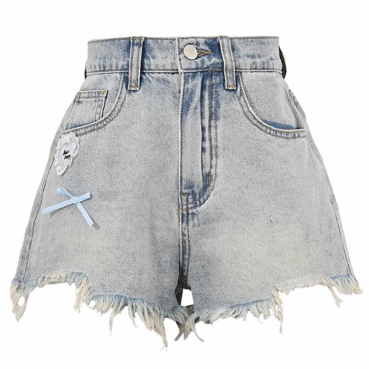 ライトブルーの切りっぱなし裾ハートアクセントヴィンテージデニムショートパンツ
