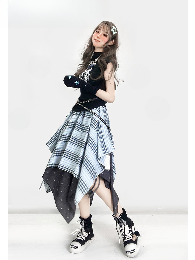 ヴィンテージダスティブルーチェック柄ハンカチ裾グラマラススカート