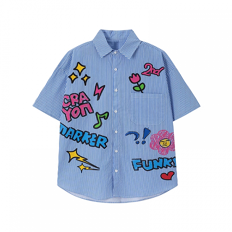 ブルーのヴィンテージ刺繍半袖ストライプシャツ