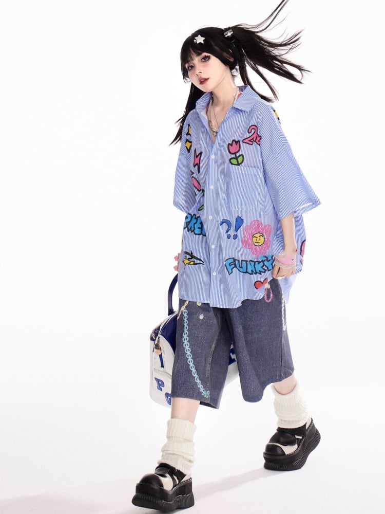 ヴィンテージ刺繍ブルーストライプシャツ 半袖