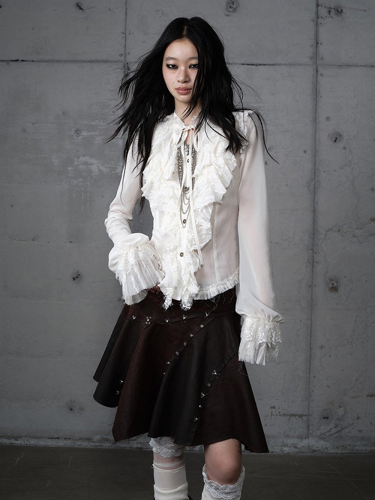 Beige Vintage Princess Blouse with Tiered Flounce Lace & Tie-Neck Detail