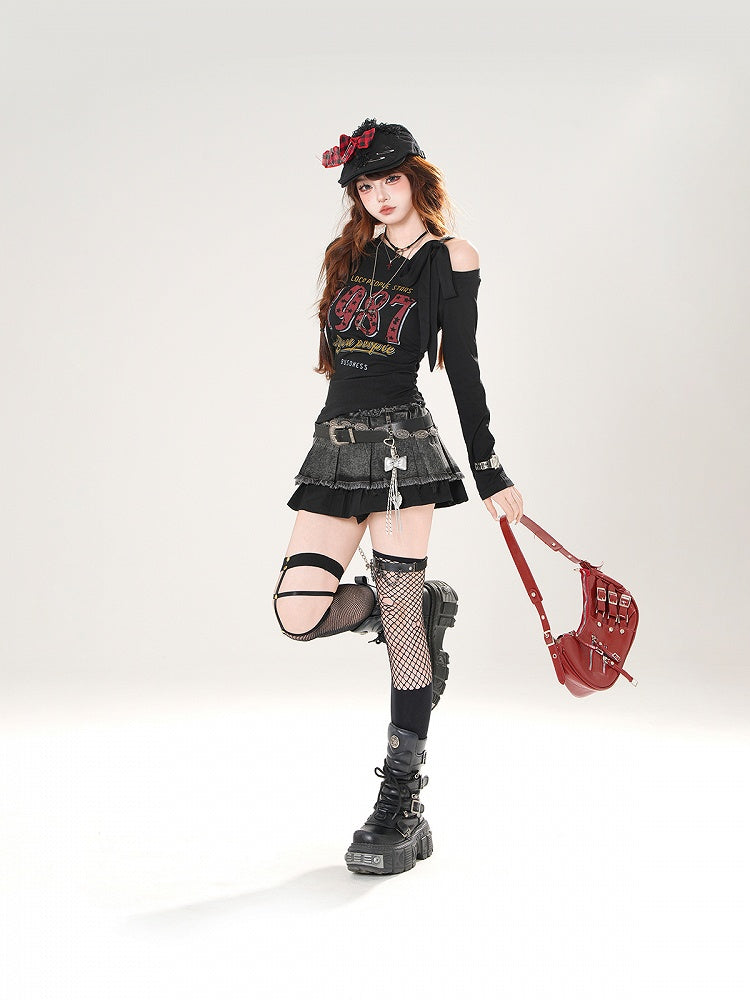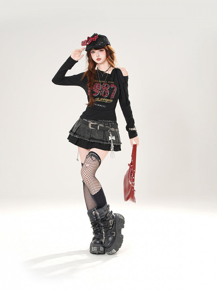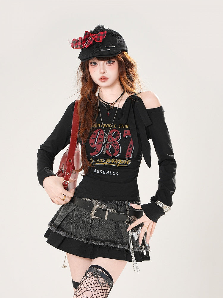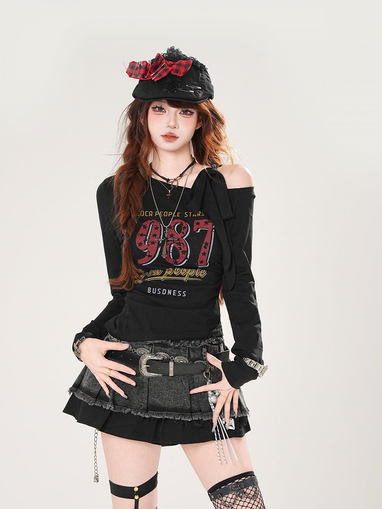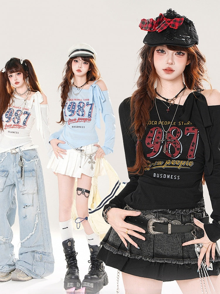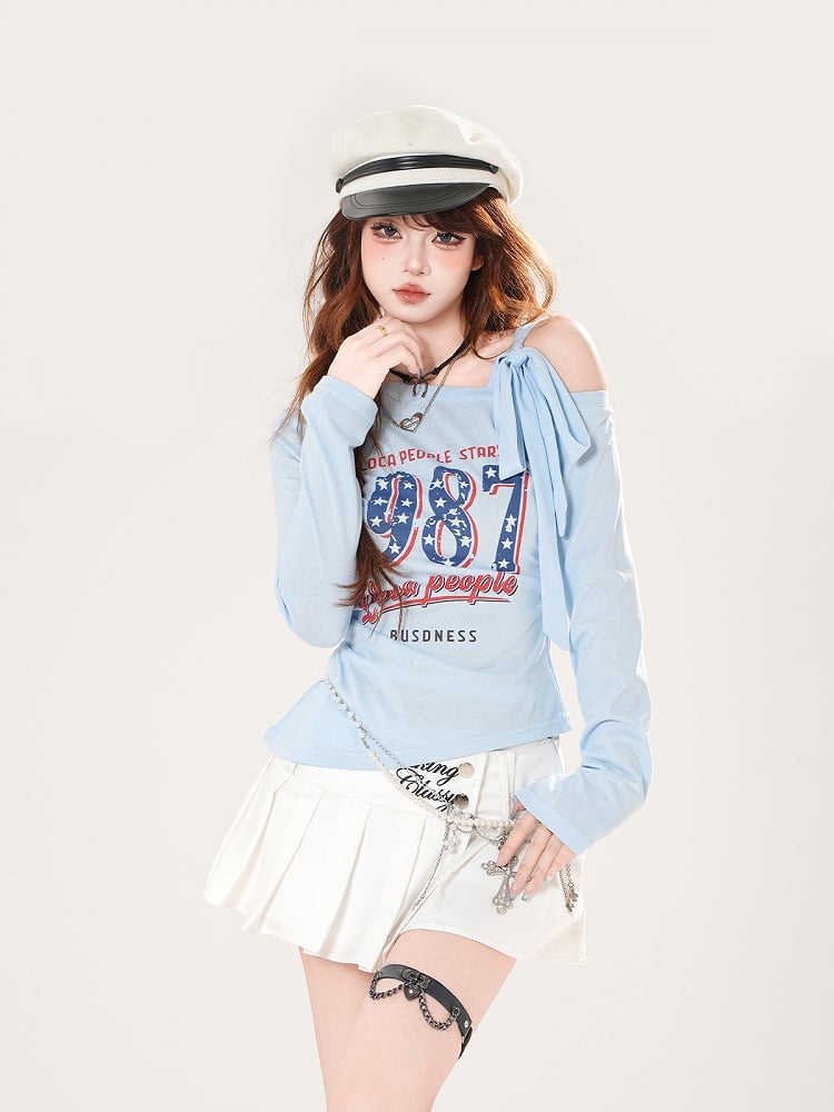 ヴィンテージナンバープリント ブルー/ホワイト/ブラック アシンメトリーネックライン トップス