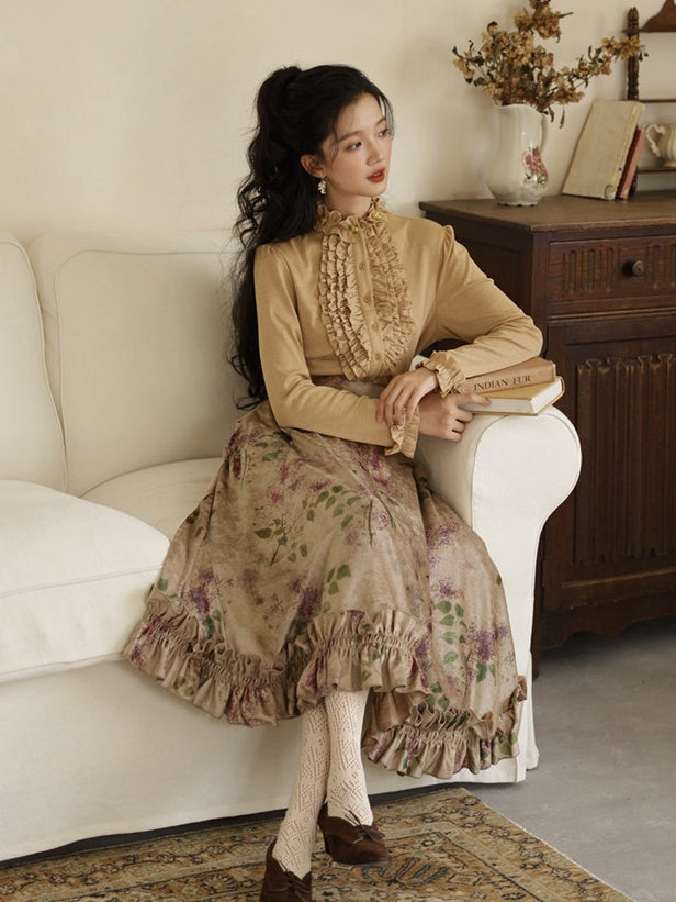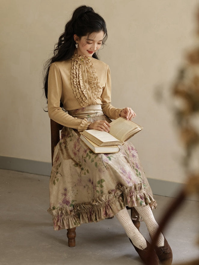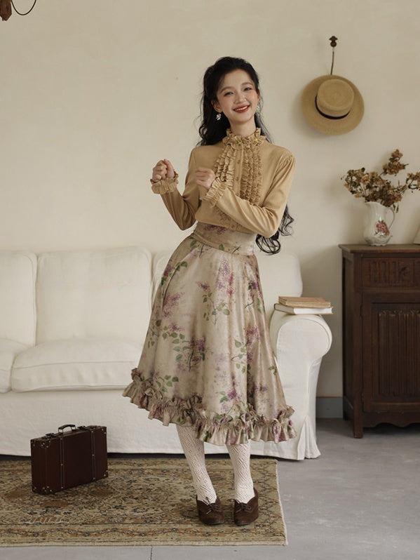 ヴィンテージパープルフローラルプリントフリルトリムハイウエストスカート
