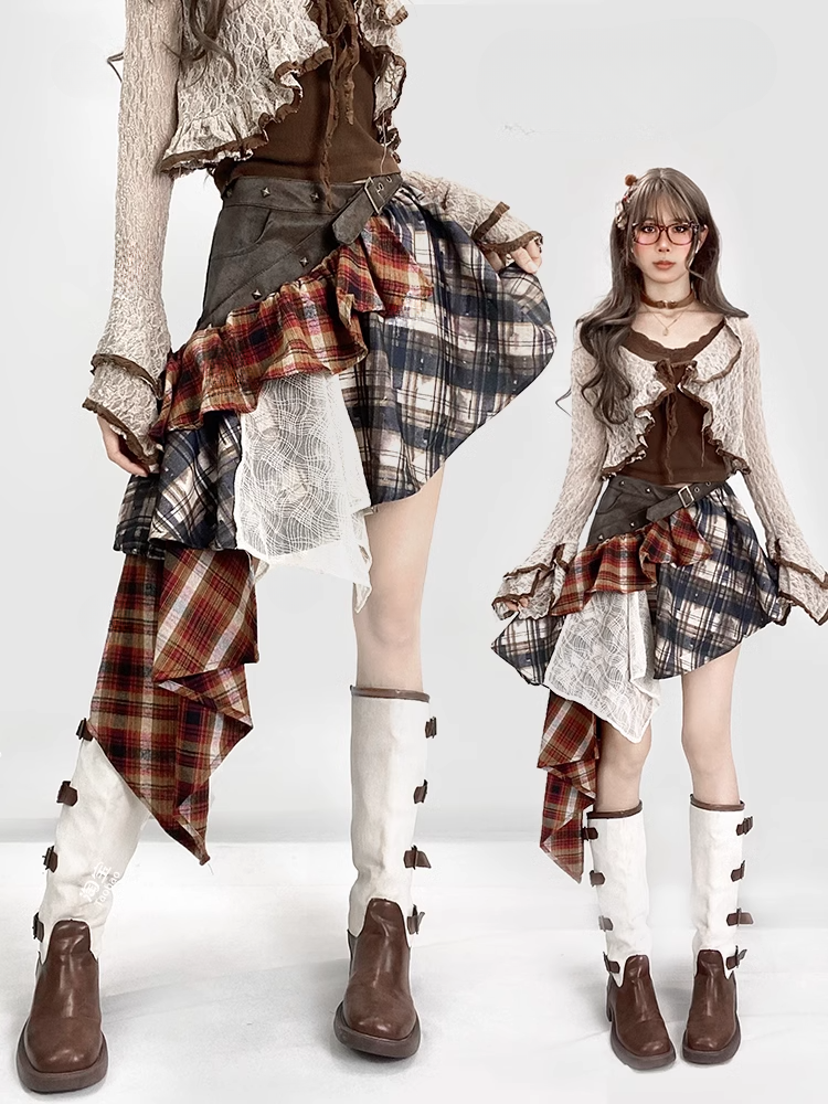 ヴィンテージレッドチェック柄ローウエストアシンメトリーヘムグラマラススカート