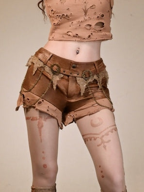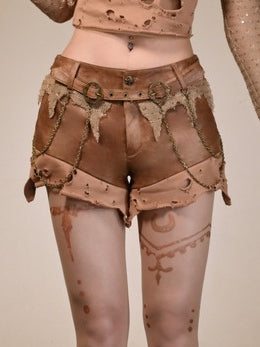 ウエストブラウンのダメージ加工ローウェイストランドパンクショーツ(チェーンアクセント付き)