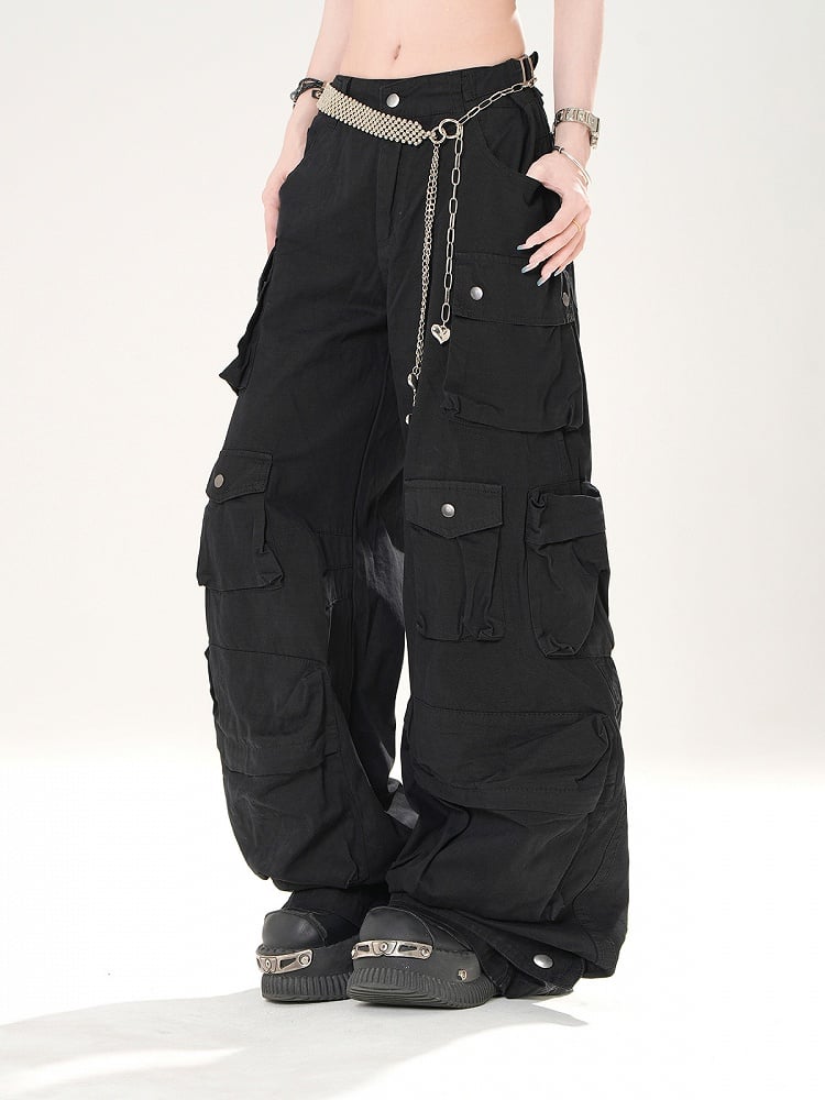 ブラック ローウエスト カーゴポケット ルーズ ワイドレッグパンツ