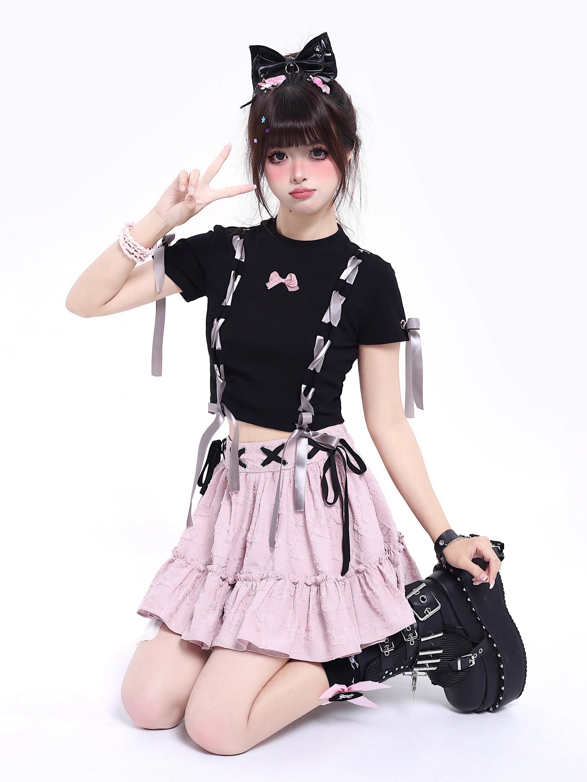 ピンクと白のオールドスクールロリータファッションドレス、蝶結びディテール、ロリータJSKセット