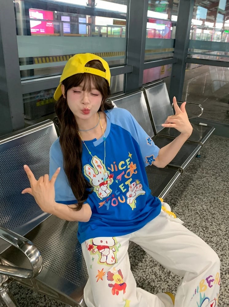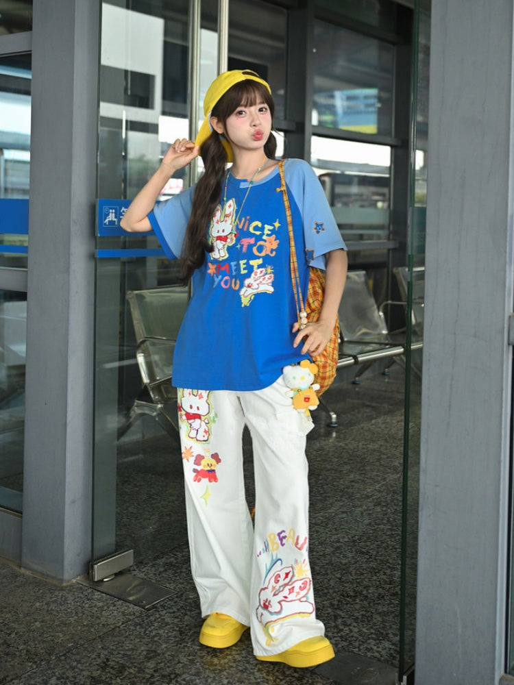 漫画のウサギ柄プリントのホワイトローウエストワイドレッグジーンズ