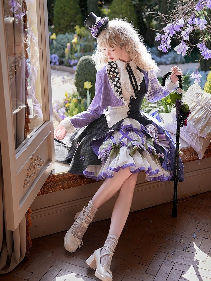 パープル王子ロリータトップスセット - ハーフストライプ、ハーフチェック柄クロップドブレザー + ハーフブラック、ハーフホワイトのバックレスウエストコート