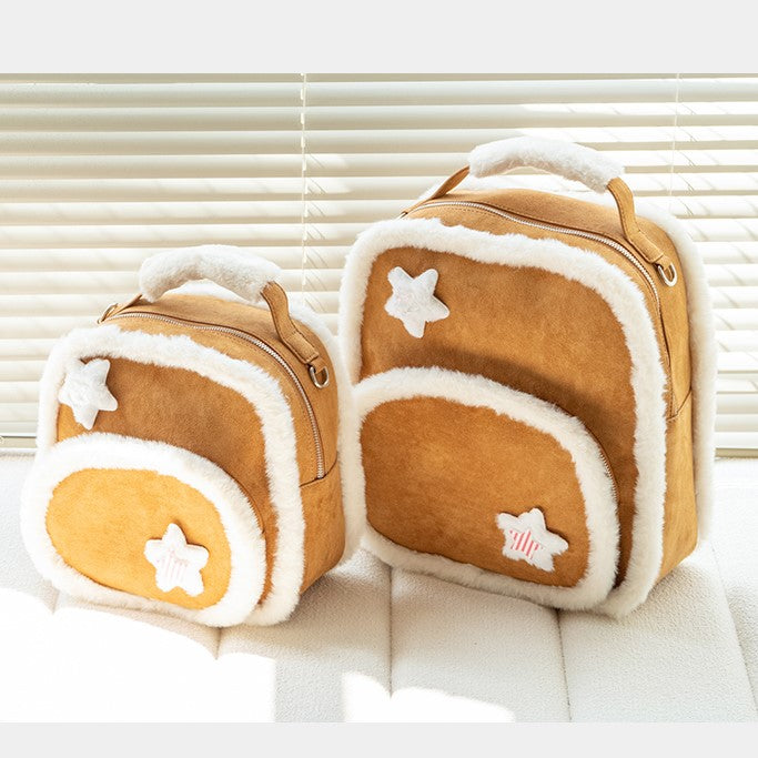 Warmy Large-Sized Brown Backpack With Plush Trim In Kawaii Style