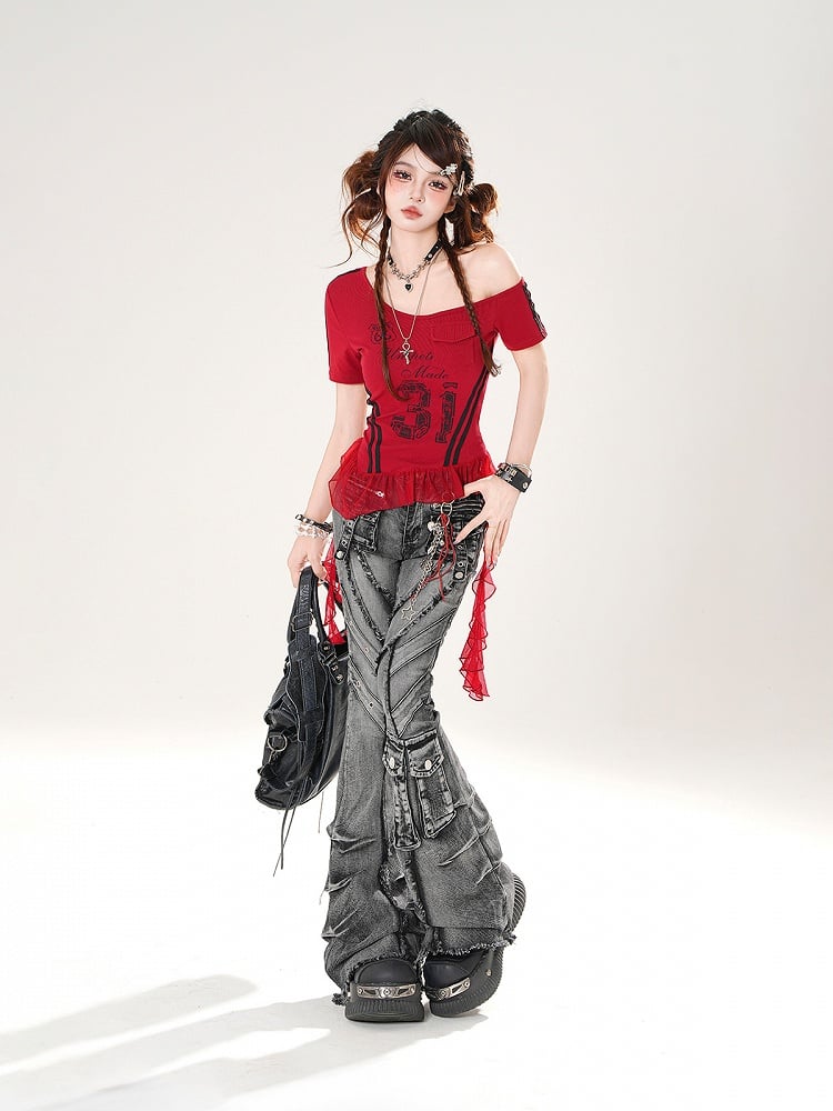 ● カーゴポケット / ダメージ加工 / フェードウォッシュ / フレアシルエット / 切りっぱなし裾
