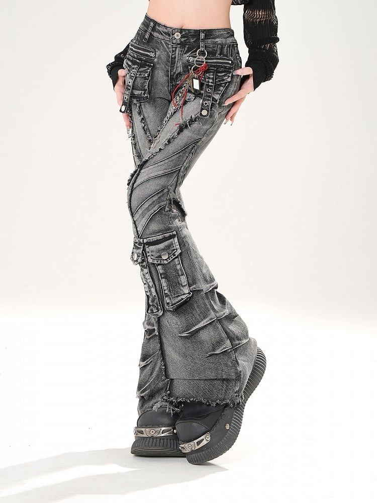 ブラック フェードウォッシュ カーゴポケット 切りっぱなし裾 ダメージ加工 フレアジーンズ