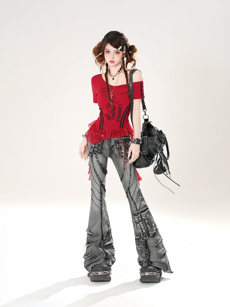 ウォッシュフレアジーンズ カーゴポケット 切りっぱなし裾 ダメージ加工 フェードブラック