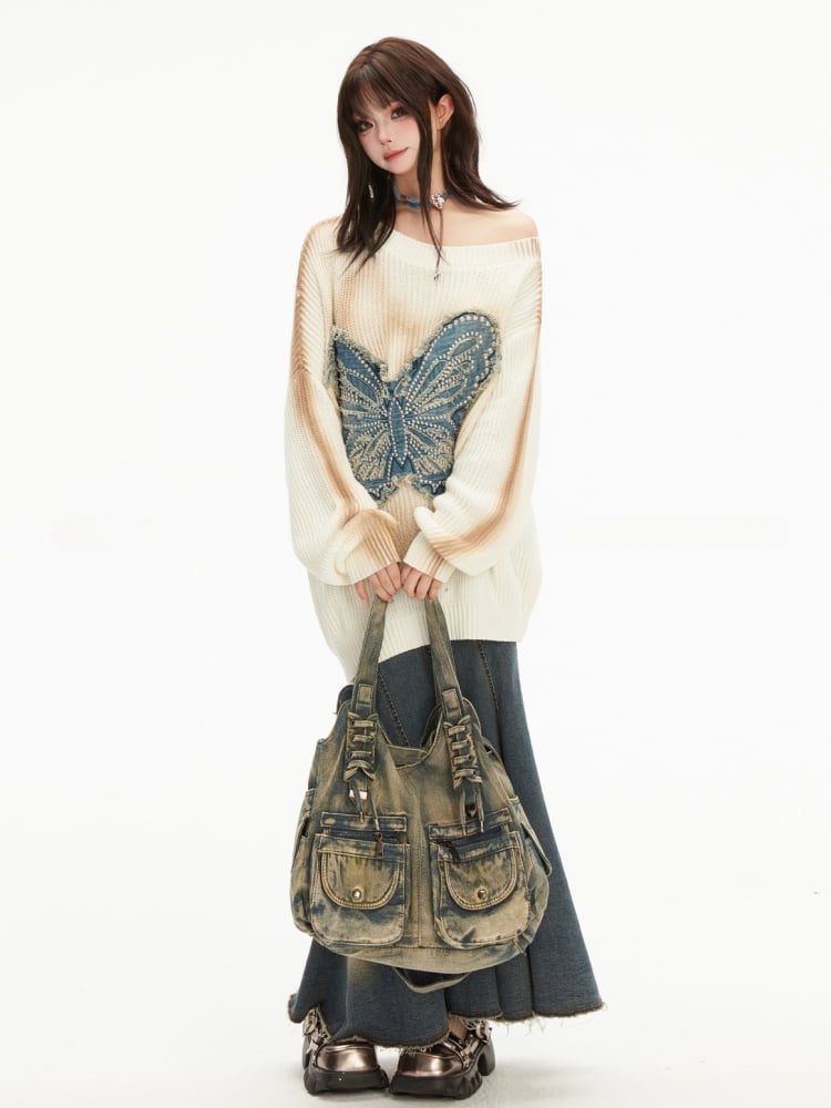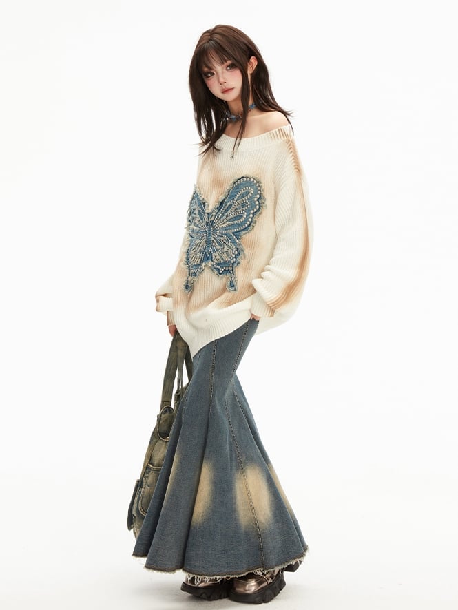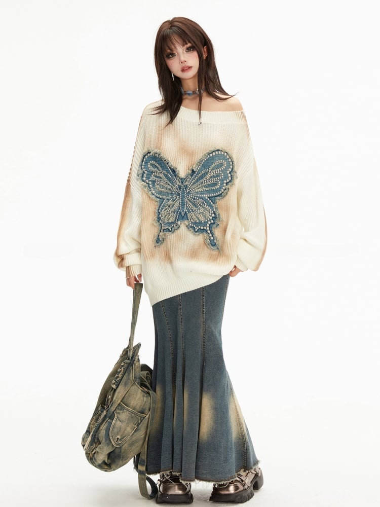 ウェイストランドパンク バタフライアップリケ アプリコット アシンメトリーネックライン セーター