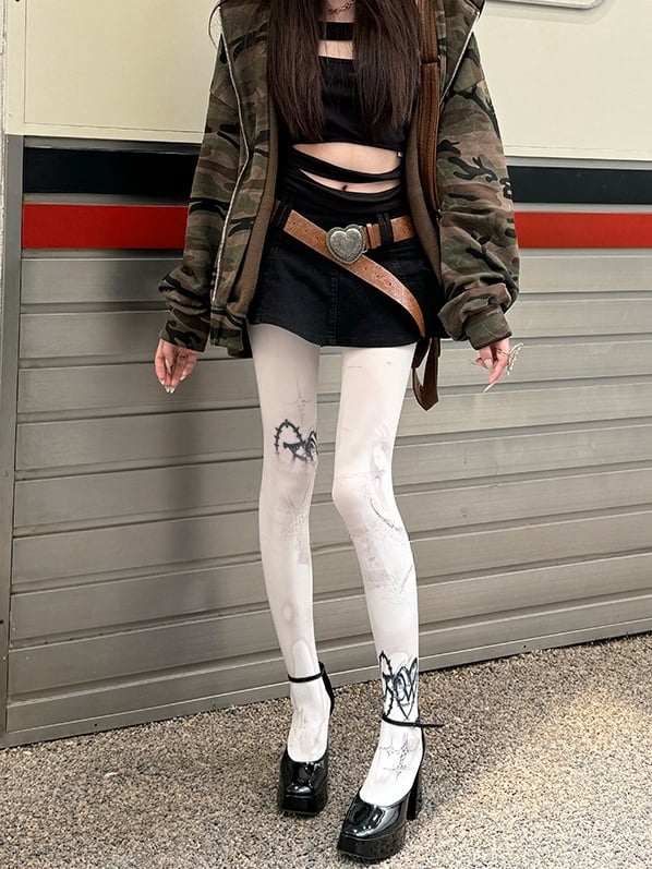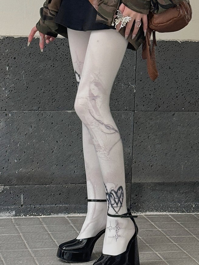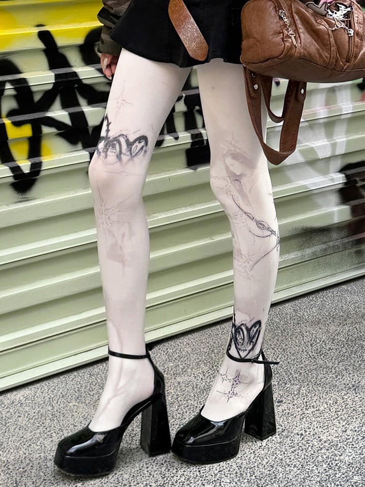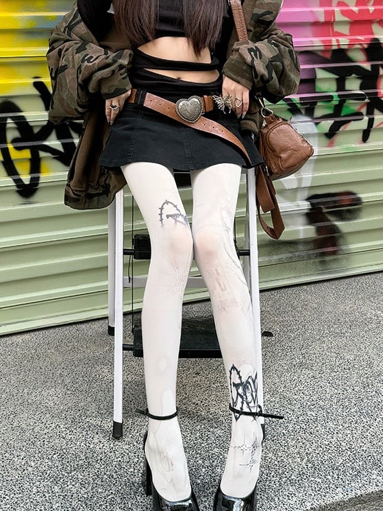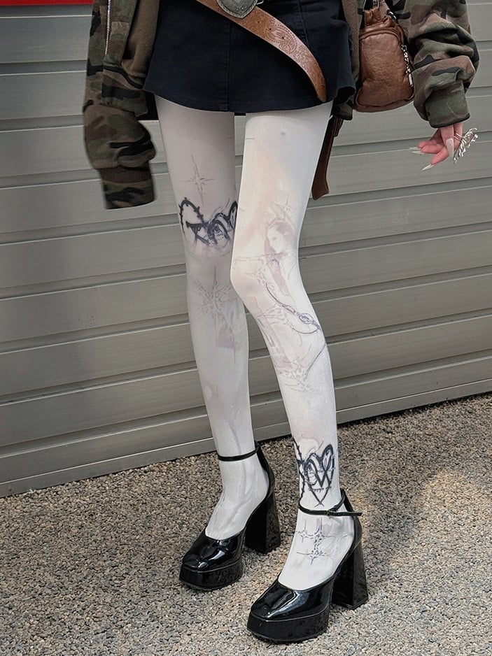 ホワイト 100D パンクプリントタイツ
