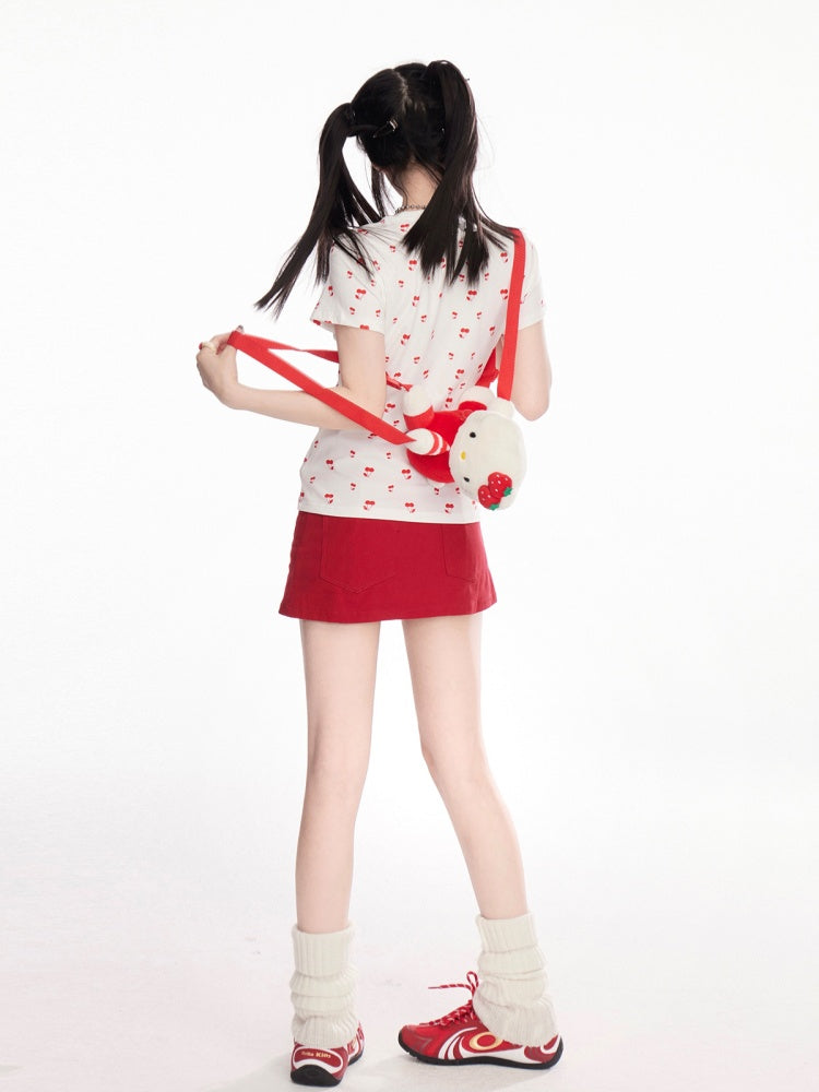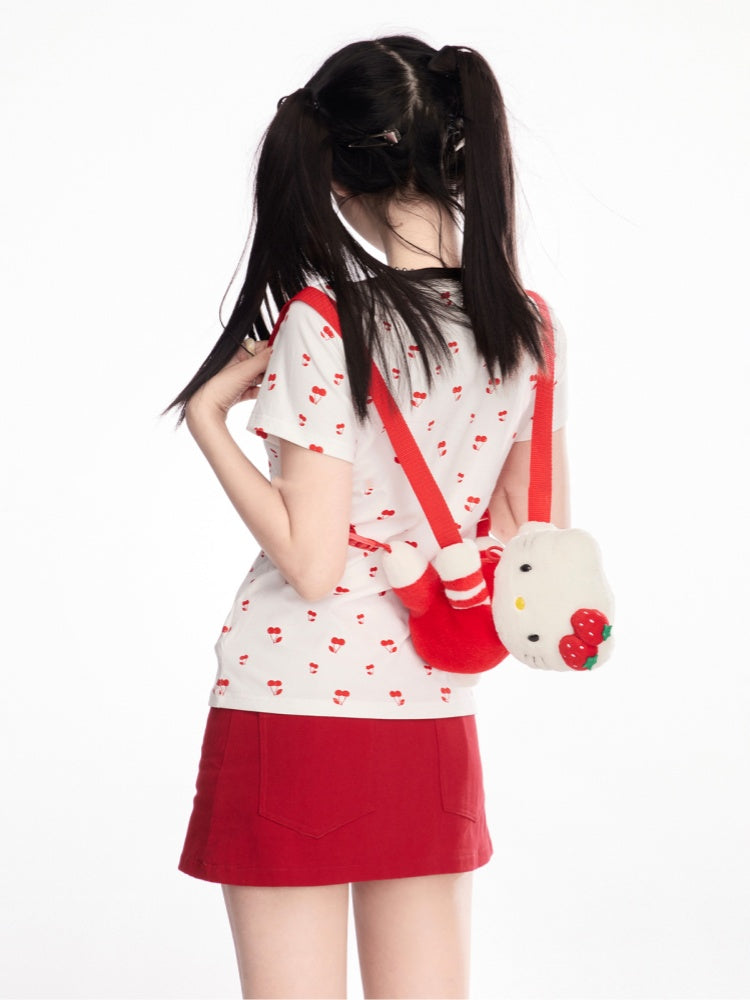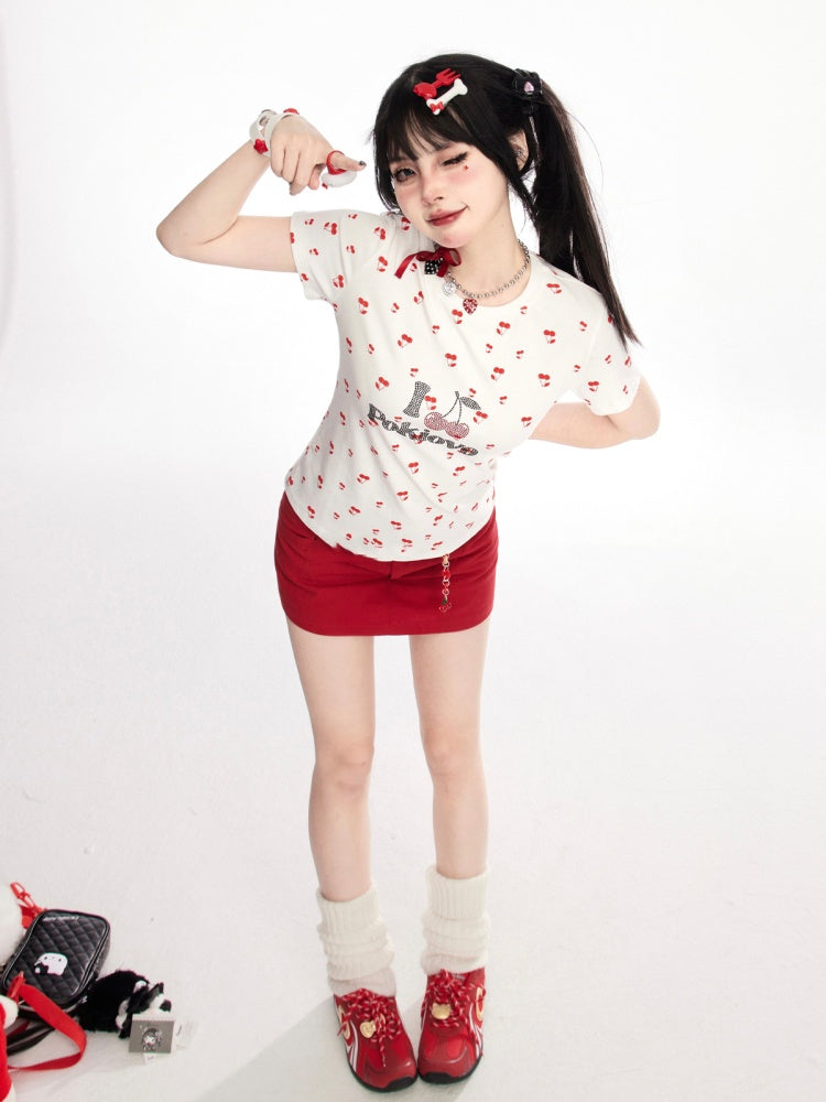 ホワイト オールオーバー チェリープリント ラインストーン レター Tシャツ