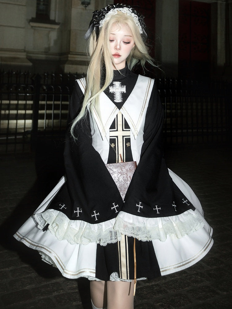 白と黒の修道女ロリータドレスフルセット - ベルスリーブ修道女ドレス + 白ケープ + 黒リボンアクセサリー
