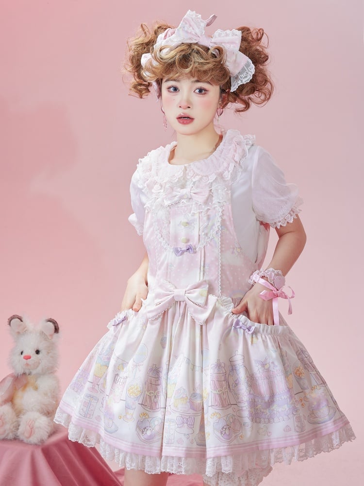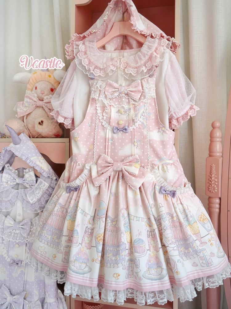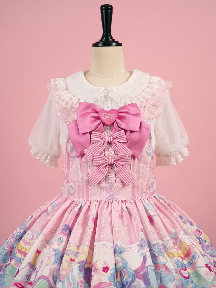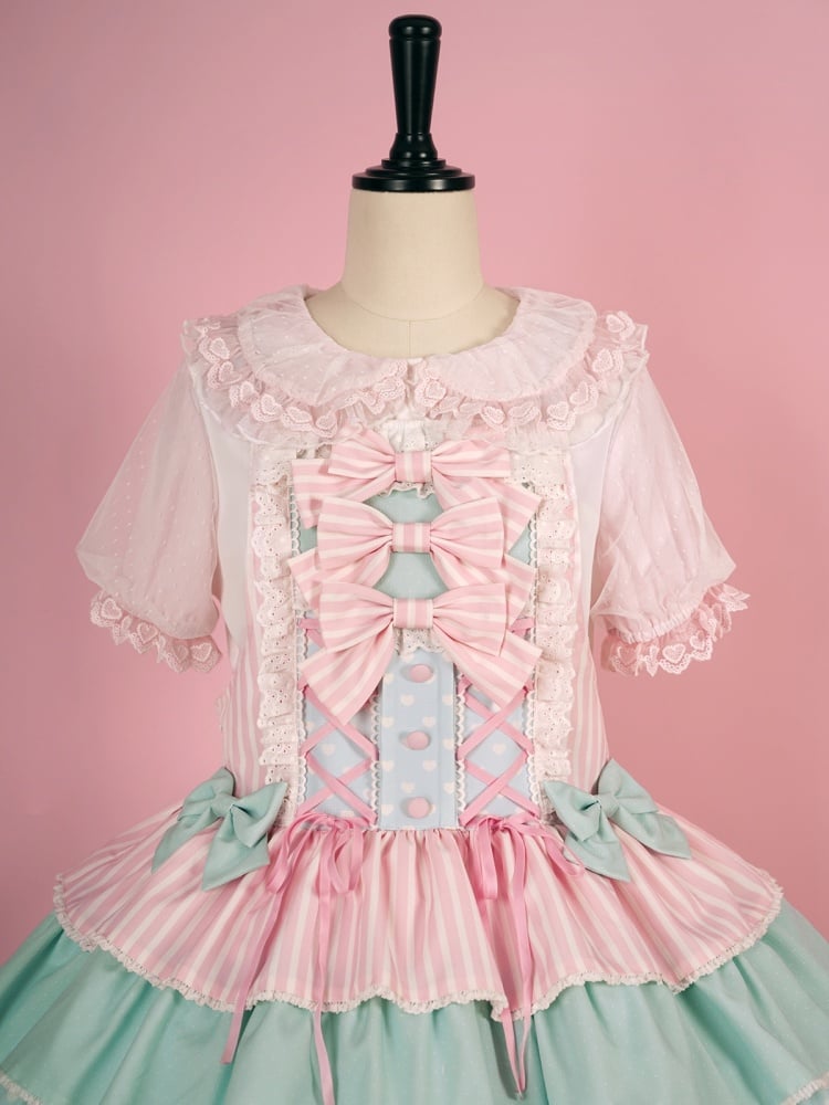 ピンクと白のオールドスクールロリータファッションドレス、蝶結びディテール、ロリータJSKセット