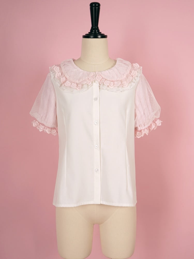 ホワイトとピンクのフリルトリムのピーターパンカラー半袖ブラウス
