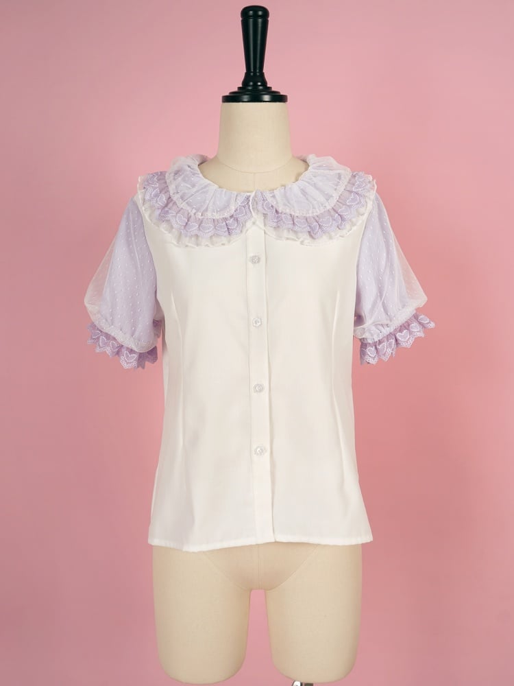 ホワイトとパープルのフリルトリム、ピーターパンカラーの半袖ブラウス