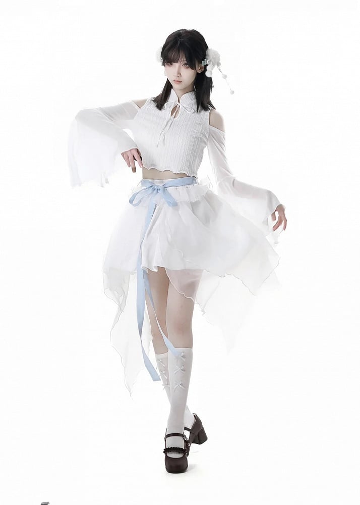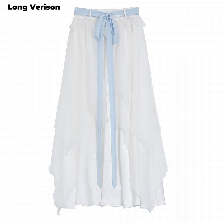 ホワイトのアシンメトリーメッシュヘムスカートバージョン(リボン付き)ショート/ロングセルフタイ