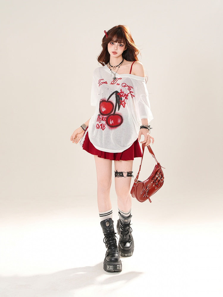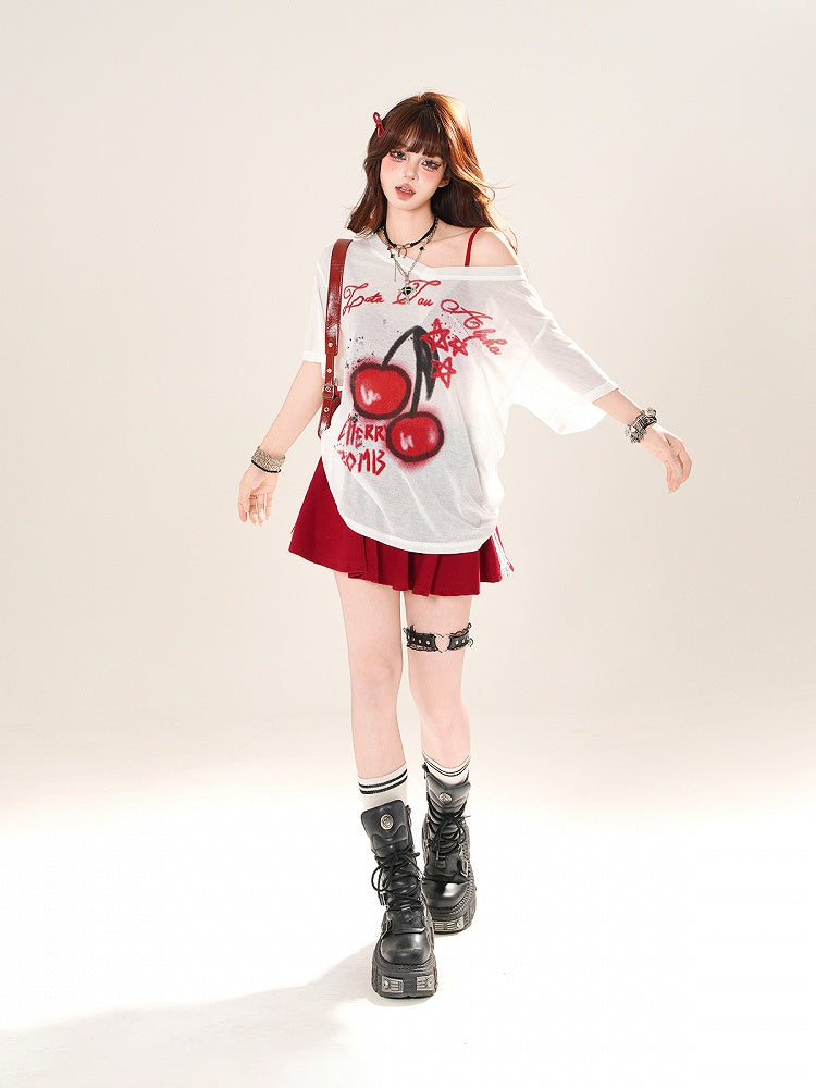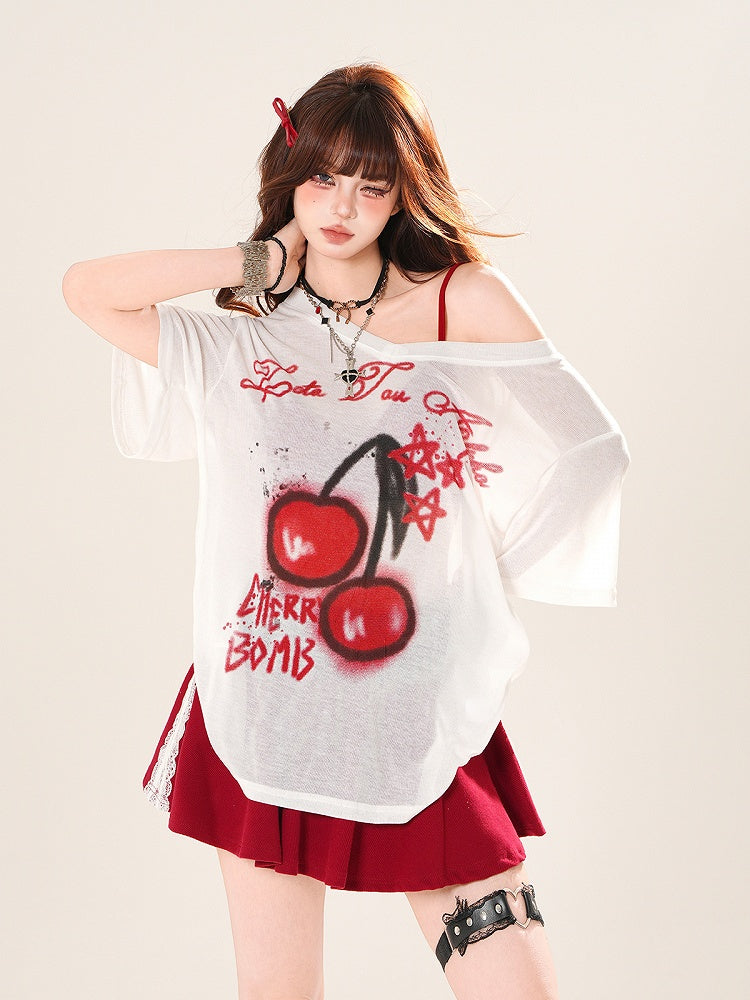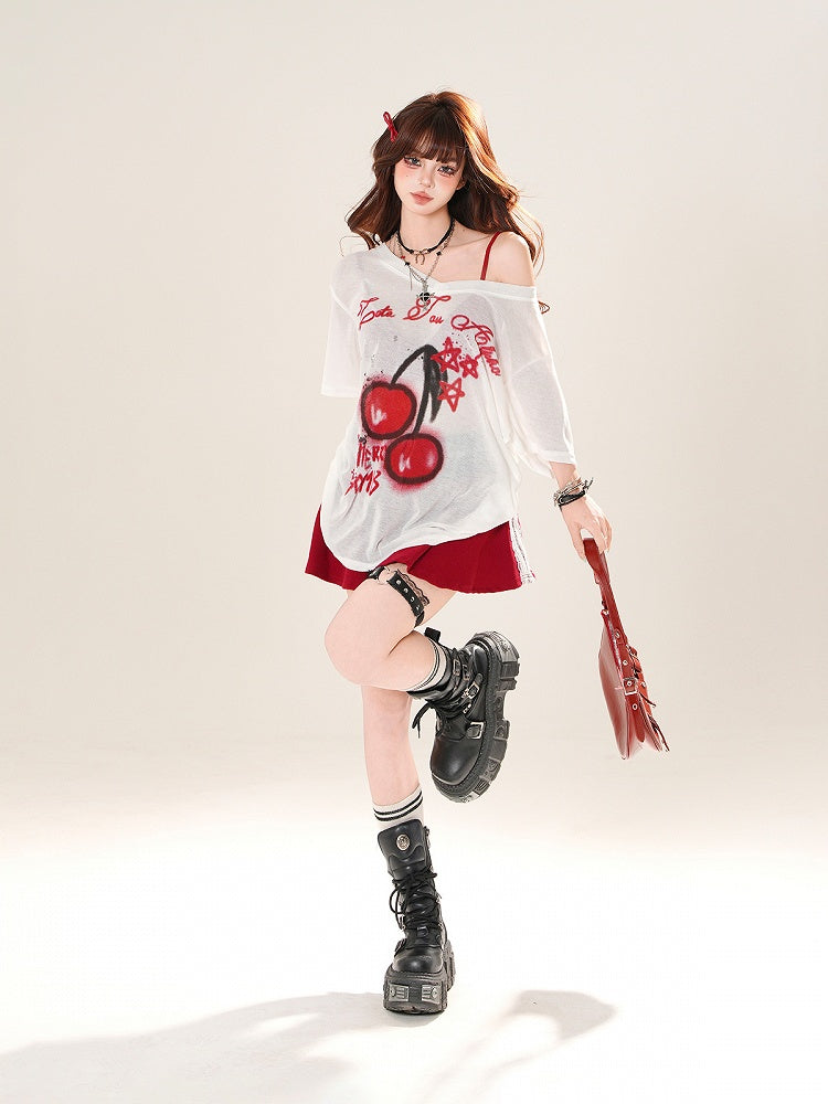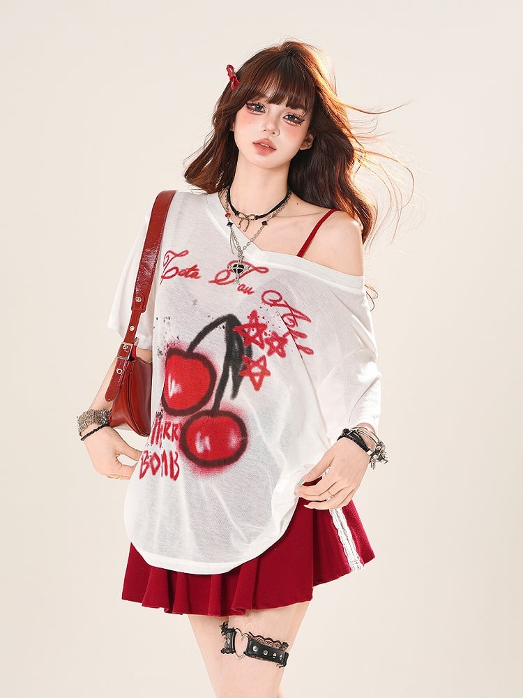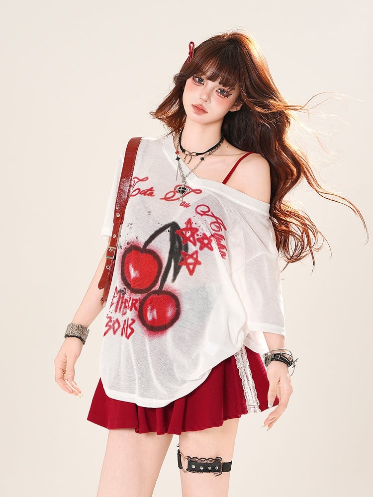 ホワイトのアシンメトリーネックライン、チェリープリントのセミシースルーカバーアップ