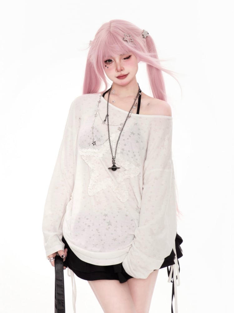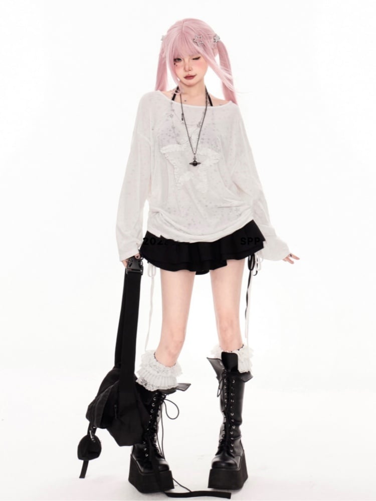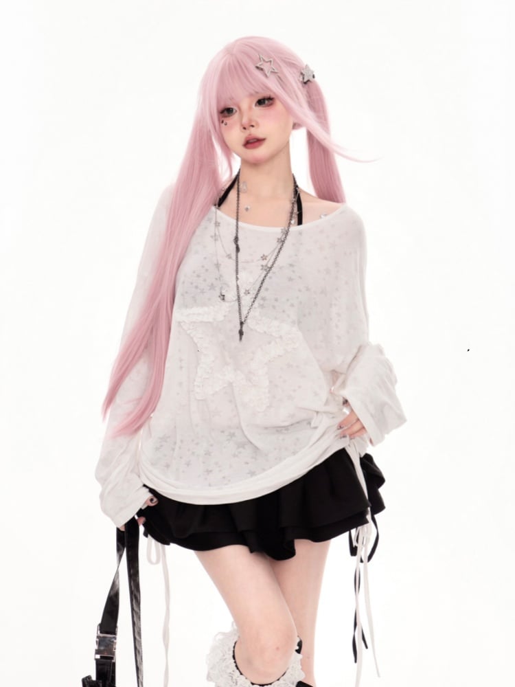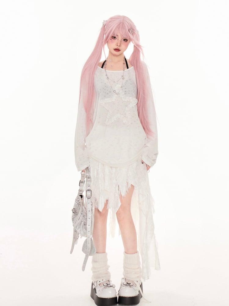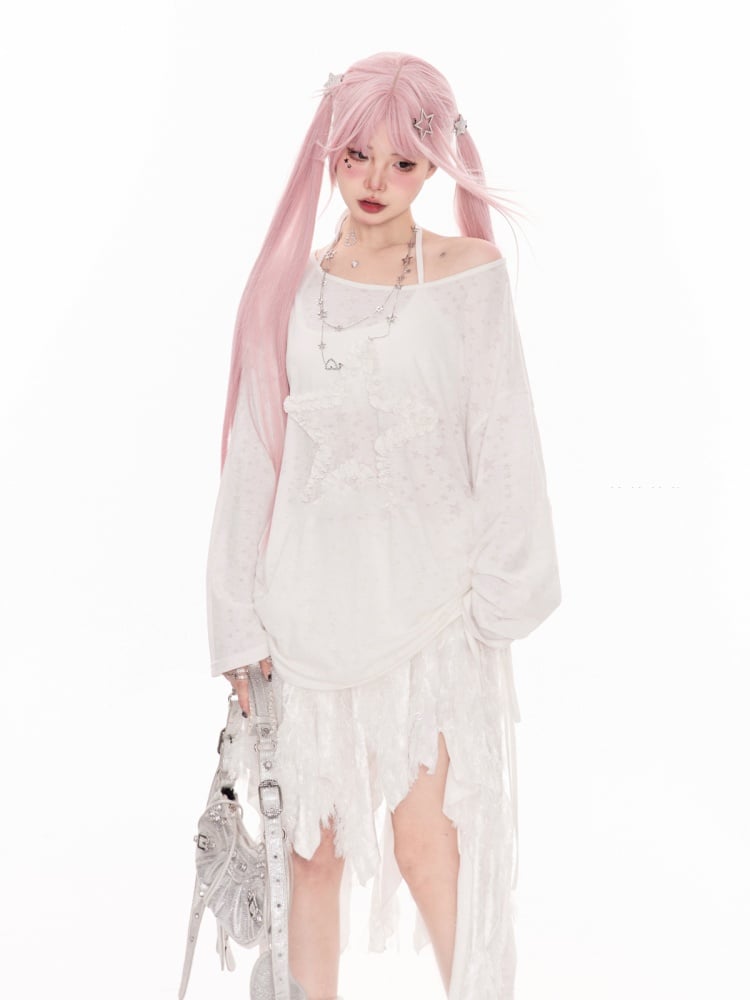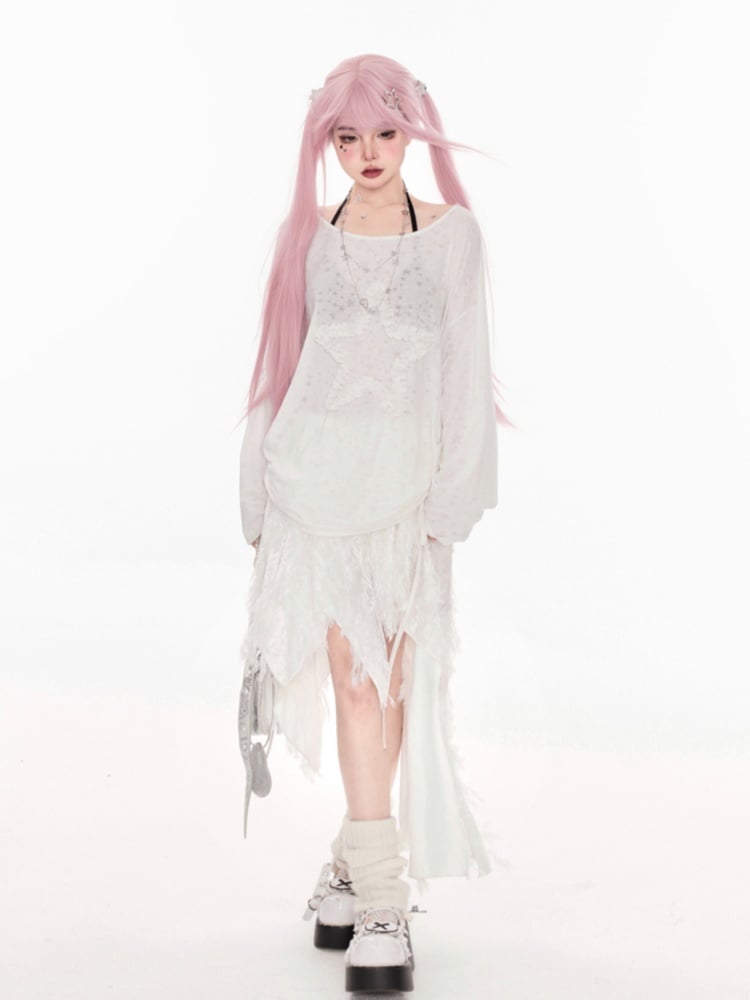 ホワイトのアシンメトリーネックライン、フリル付きスタードローストリングサイドカバーアップ