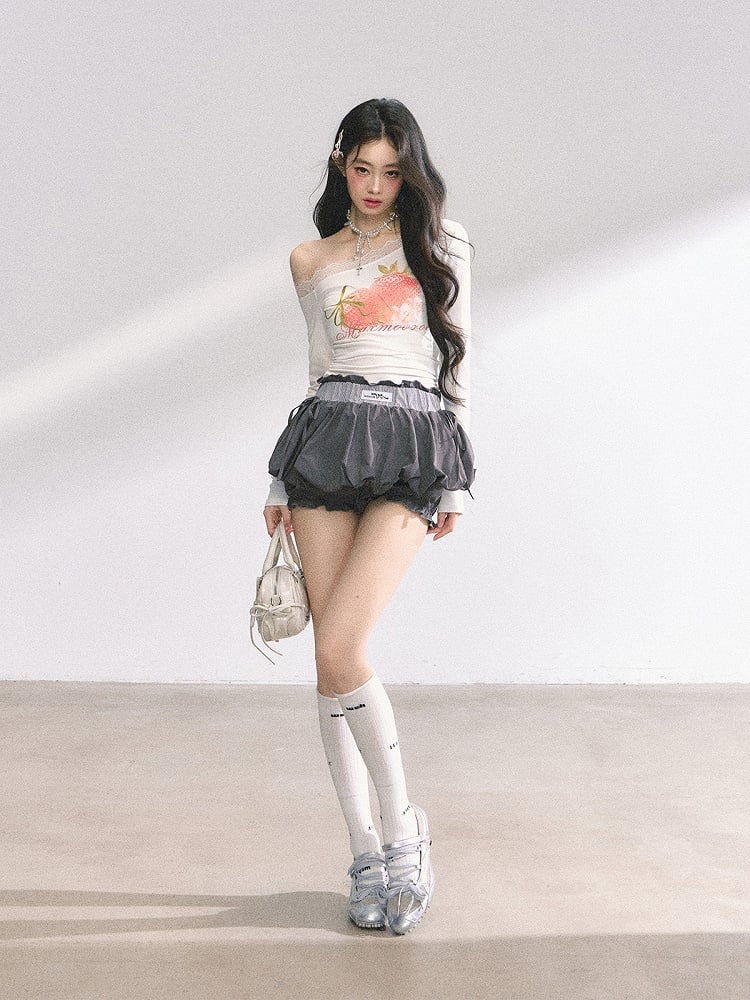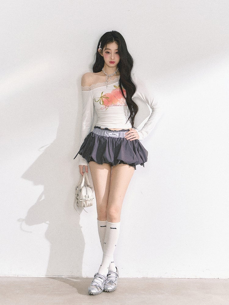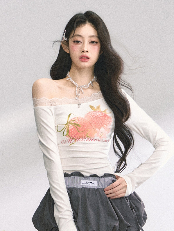 ホワイト アシンメトリーネックライン ストロベリープリント トップス