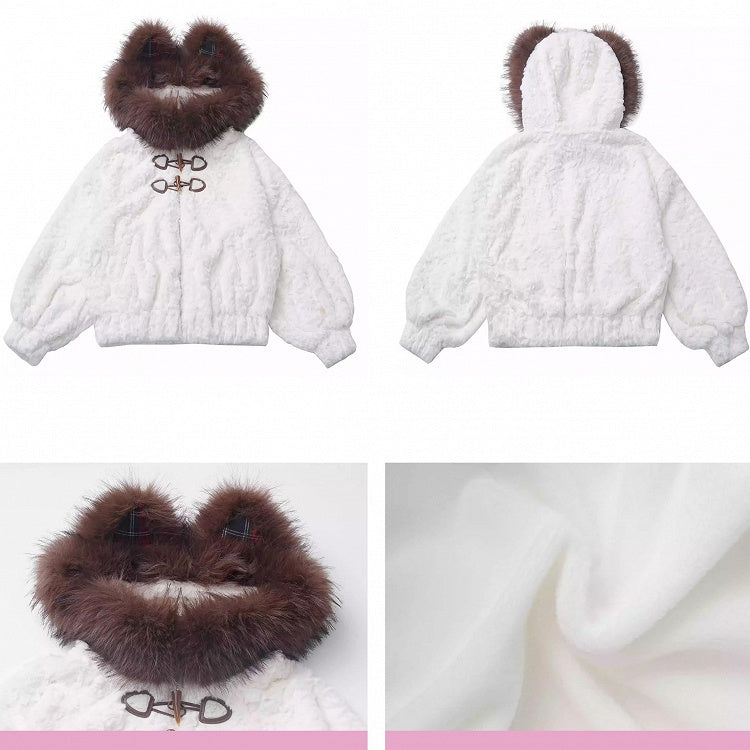 ホワイトベアの耳が付いたフード付きプラッシュコートで、暖かく可愛く過ごしましょう。肌寒い日にぴったりの、キュートなベアの耳と柔らかな素材が、暖かくスタイリッシュにあなたを包み込みます。このコートで、キュートで快適な毎日をお過ごしください!