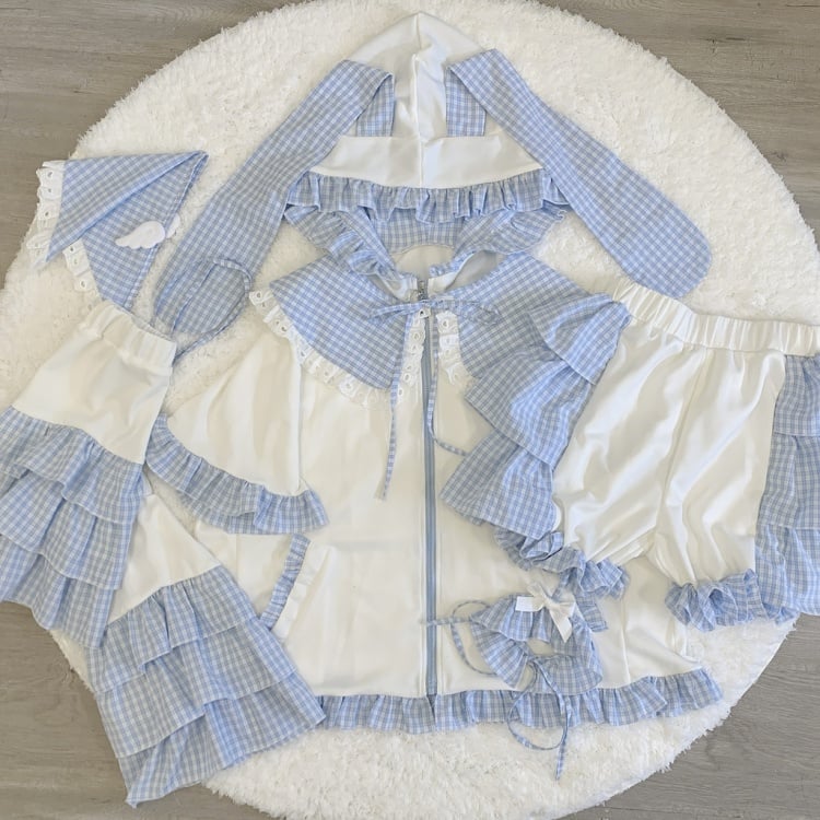 ホワイトブルーチェック柄うさぎ耳フルセット