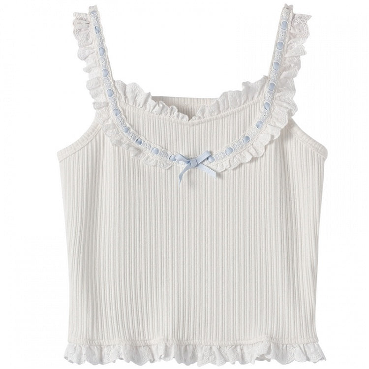 ホワイトリボンフリルレーストリムスリムフィットキャミソールトップ